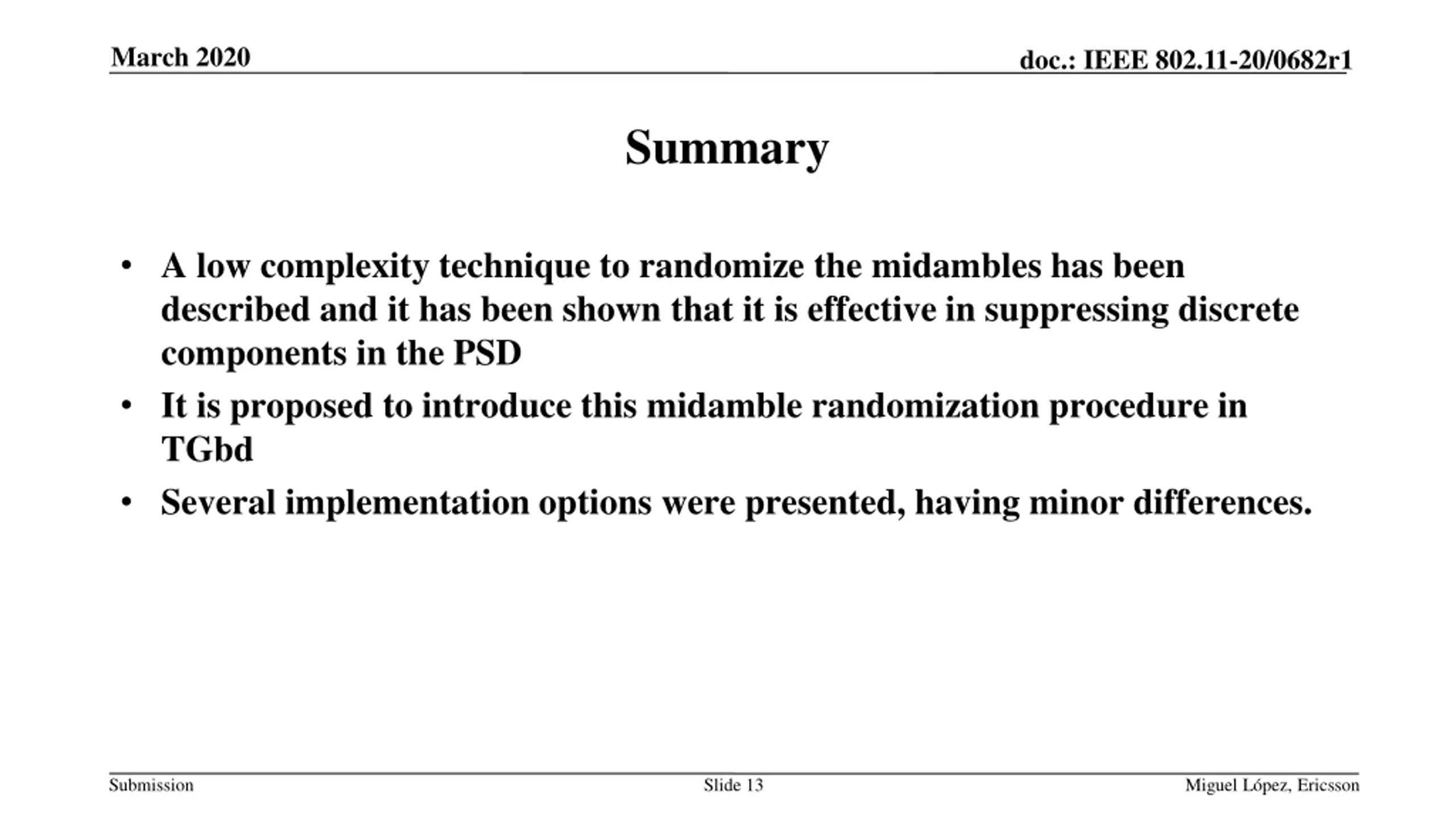 March 2020 doc.: IEEE 802.11-20/0682r1 Summary A low complexity technique to randomize the midambles has been described and it has been shown that it is effective in suppressing discrete components in the PSD It is proposed to introduce this midamble randomization procedure in TGbd Several implementation options were presented, having minor differences. Submission Slide 13 Miguel L pez, Ericsson