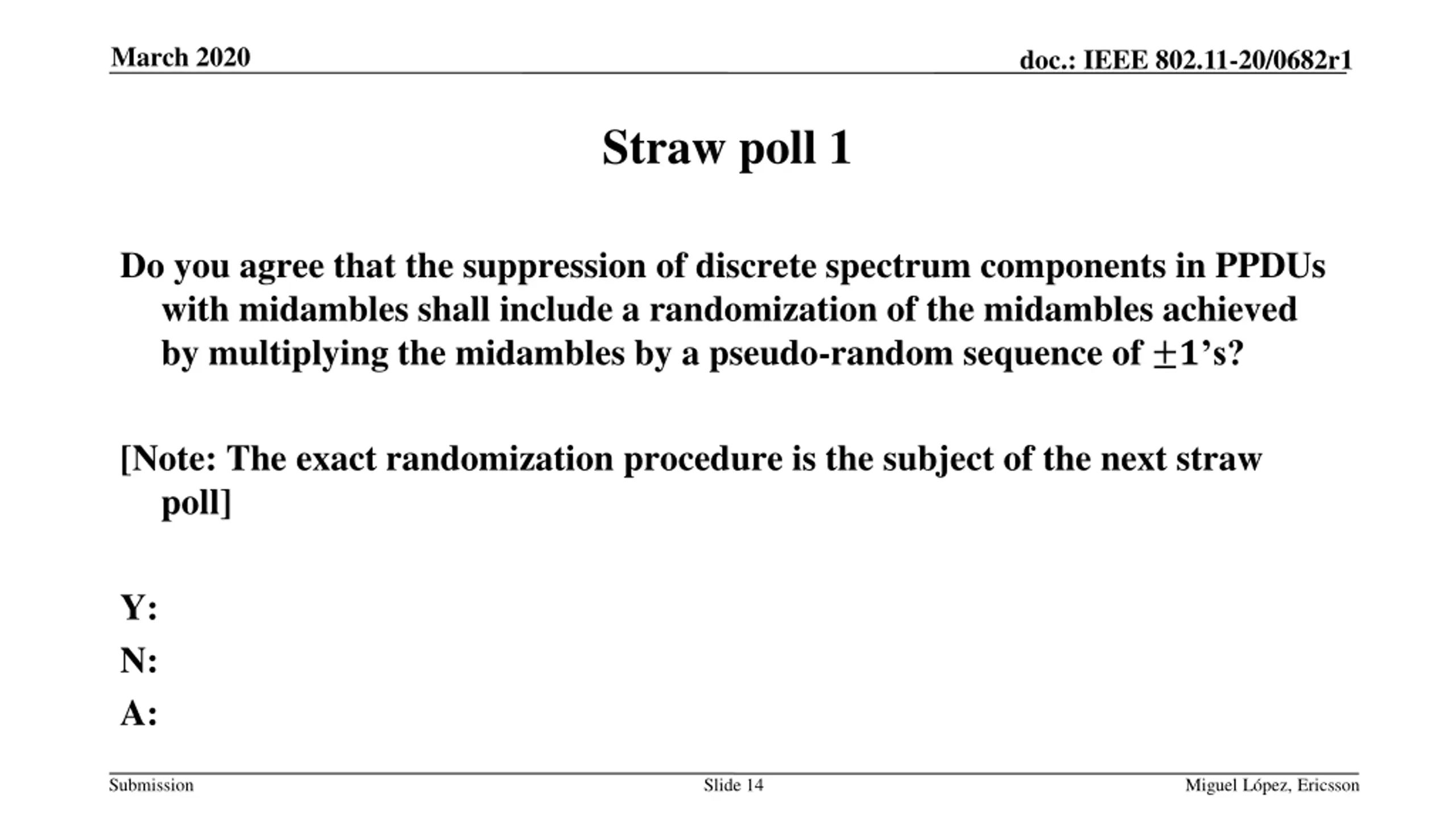 March 2020 doc.: IEEE 802.11-20/0682r1 Straw poll 1 Do you agree that the suppression of discrete spectrum components in PPDUs with midambles shall include a randomization of the midambles achieved by multiplying the midambles by a pseudo-random sequence of ? s? [Note: The exact randomization procedure is the subject of the next straw poll] Y: N: A: Submission Slide 14 Miguel L pez, Ericsson