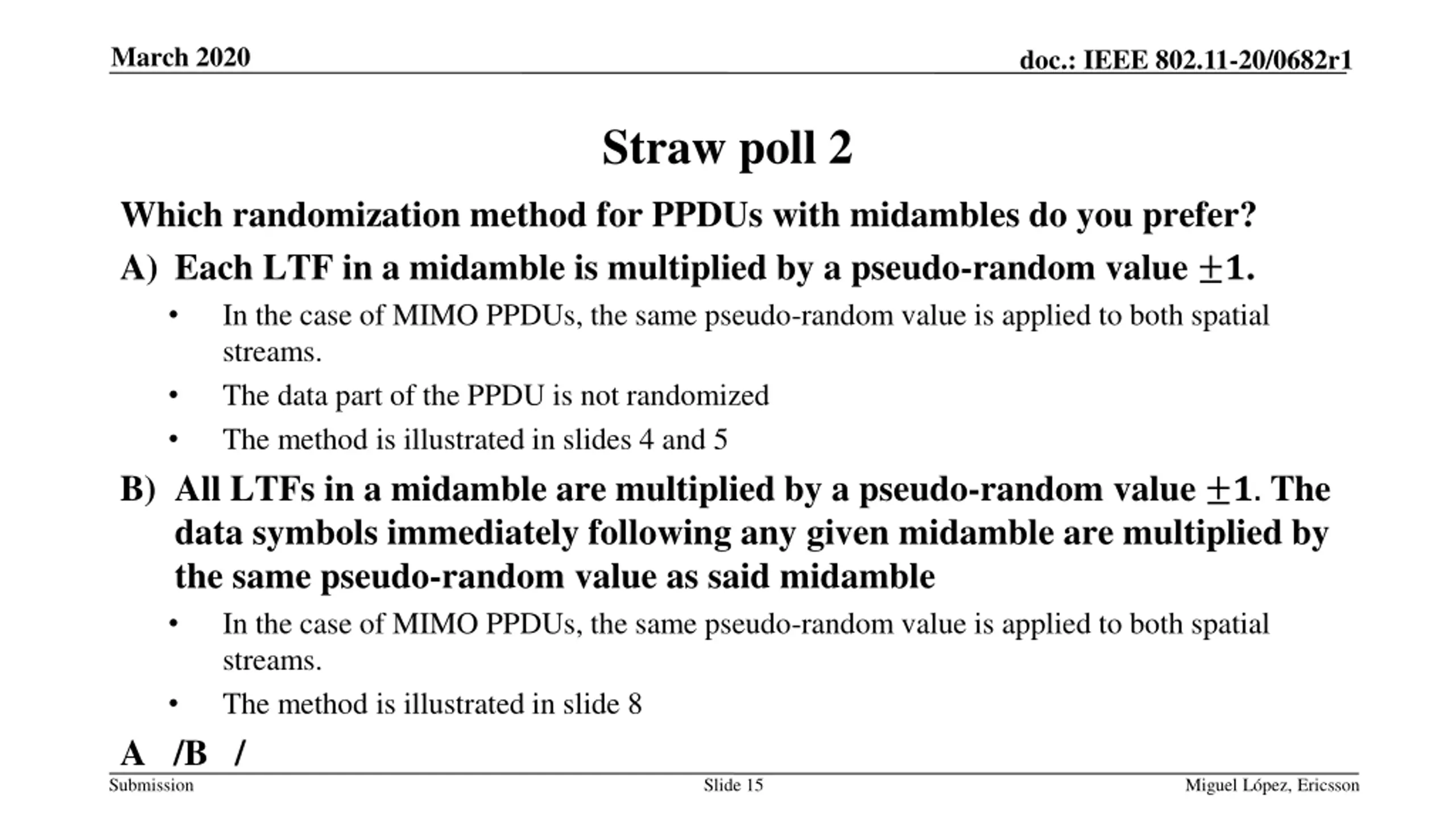 March 2020 doc.: IEEE 802.11-20/0682r1 Straw poll 2 Which randomization method for PPDUs with midambles do you prefer? A) Each LTF in a midamble is multiplied by a pseudo-random value ?. In the case of MIMO PPDUs, the same pseudo-random value is applied to both spatial streams. The data part of the PPDU is not randomized The method is illustrated in slides 4 and 5 B) All LTFs in a midamble are multiplied by a pseudo-random value ?. The data symbols immediately following any given midamble are multiplied by the same pseudo-random value as said midamble In the case of MIMO PPDUs, the same pseudo-random value is applied to both spatial streams. The method is illustrated in slide 8 A /B / Slide 15 Submission Miguel L pez, Ericsson