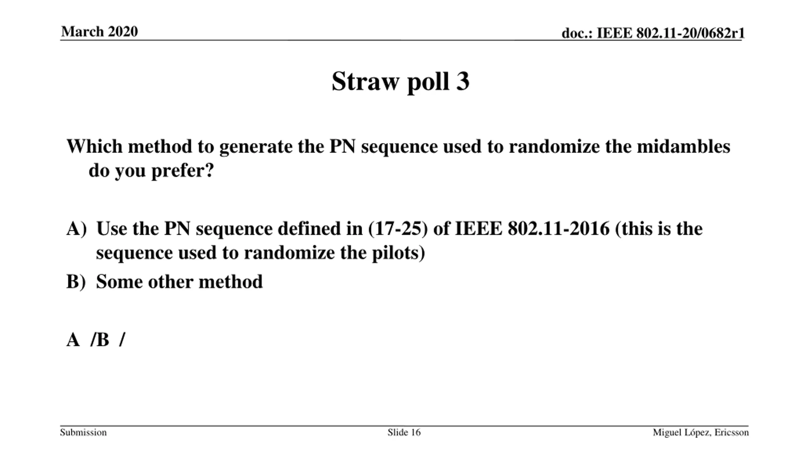 March 2020 doc.: IEEE 802.11-20/0682r1 Straw poll 3 Which method to generate the PN sequence used to randomize the midambles do you prefer? A) Use the PN sequence defined in (17-25) of IEEE 802.11-2016 (this is the sequence used to randomize the pilots) B) Some other method A /B / Submission Slide 16 Miguel L pez, Ericsson
