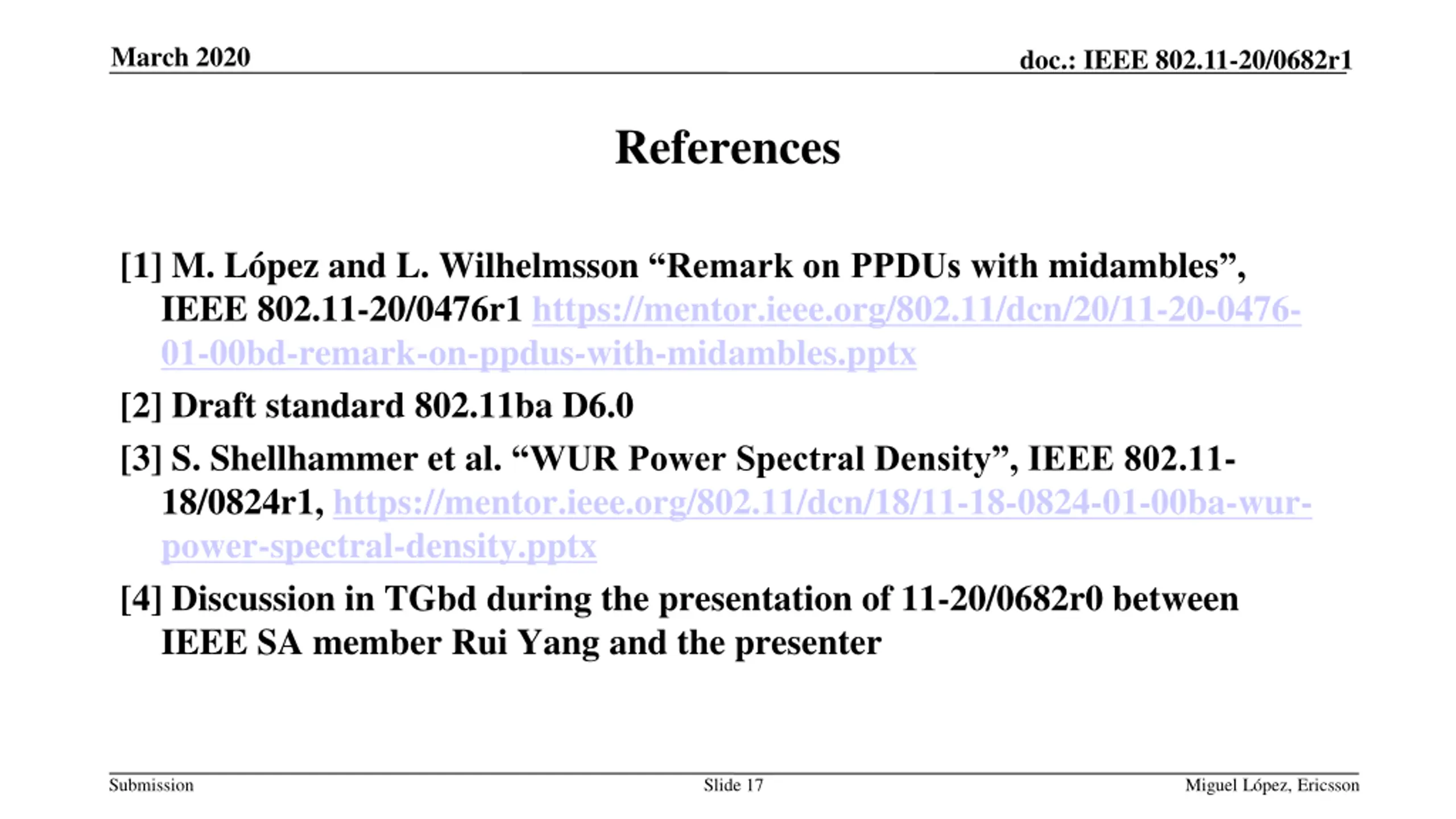 March 2020 doc.: IEEE 802.11-20/0682r1 References [1] M. L pez and L. Wilhelmsson Remark on PPDUs with midambles , IEEE 802.11-20/0476r1 https://mentor.ieee.org/802.11/dcn/20/11-20-0476- 01-00bd-remark-on-ppdus-with-midambles.pptx [2] Draft standard 802.11ba D6.0 [3] S. Shellhammer et al. WUR Power Spectral Density , IEEE 802.11- 18/0824r1, https://mentor.ieee.org/802.11/dcn/18/11-18-0824-01-00ba-wur- power-spectral-density.pptx [4] Discussion in TGbd during the presentation of 11-20/0682r0 between IEEE SA member Rui Yang and the presenter Submission Slide 17 Miguel L pez, Ericsson