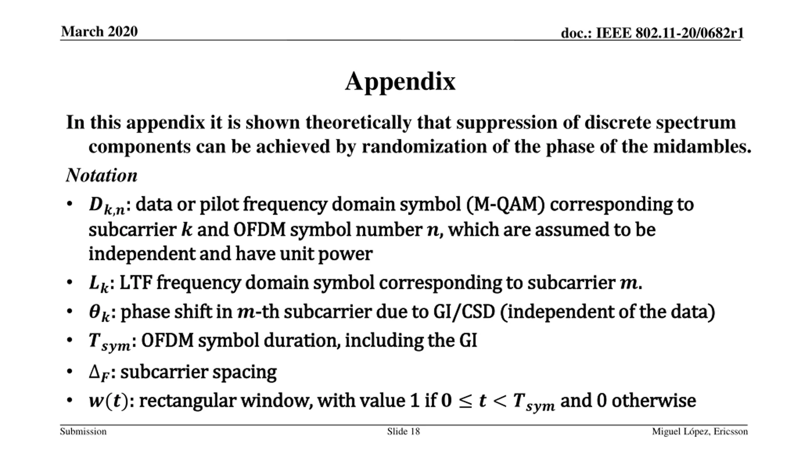 March 2020 doc.: IEEE 802.11-20/0682r1 Appendix In this appendix it is shown theoretically that suppression of discrete spectrum components can be achieved by randomization of the phase of the midambles. Notation ??,?: data or pilot frequency domain symbol (M : data or pilot frequency domain symbol (M- -QAM) corresponding to subcarrier subcarrier ? and OFDM symbol number and OFDM symbol number ?, which are assumed to be independent and have unit power independent and have unit power ??: LTF frequency domain symbol corresponding to subcarrier : LTF frequency domain symbol corresponding to subcarrier ?. . ??: phase shift in : phase shift in ?- -th subcarrier due to GI/CSD (independent of the data) th subcarrier due to GI/CSD (independent of the data) ????: OFDM symbol duration, including the GI : OFDM symbol duration, including the GI ?: subcarrier spacing : subcarrier spacing ?(?): rectangular window, with value 1 if : rectangular window, with value 1 if ? ? < ????and 0 otherwise QAM) corresponding to , which are assumed to be and 0 otherwise Submission Slide 18 Miguel L pez, Ericsson