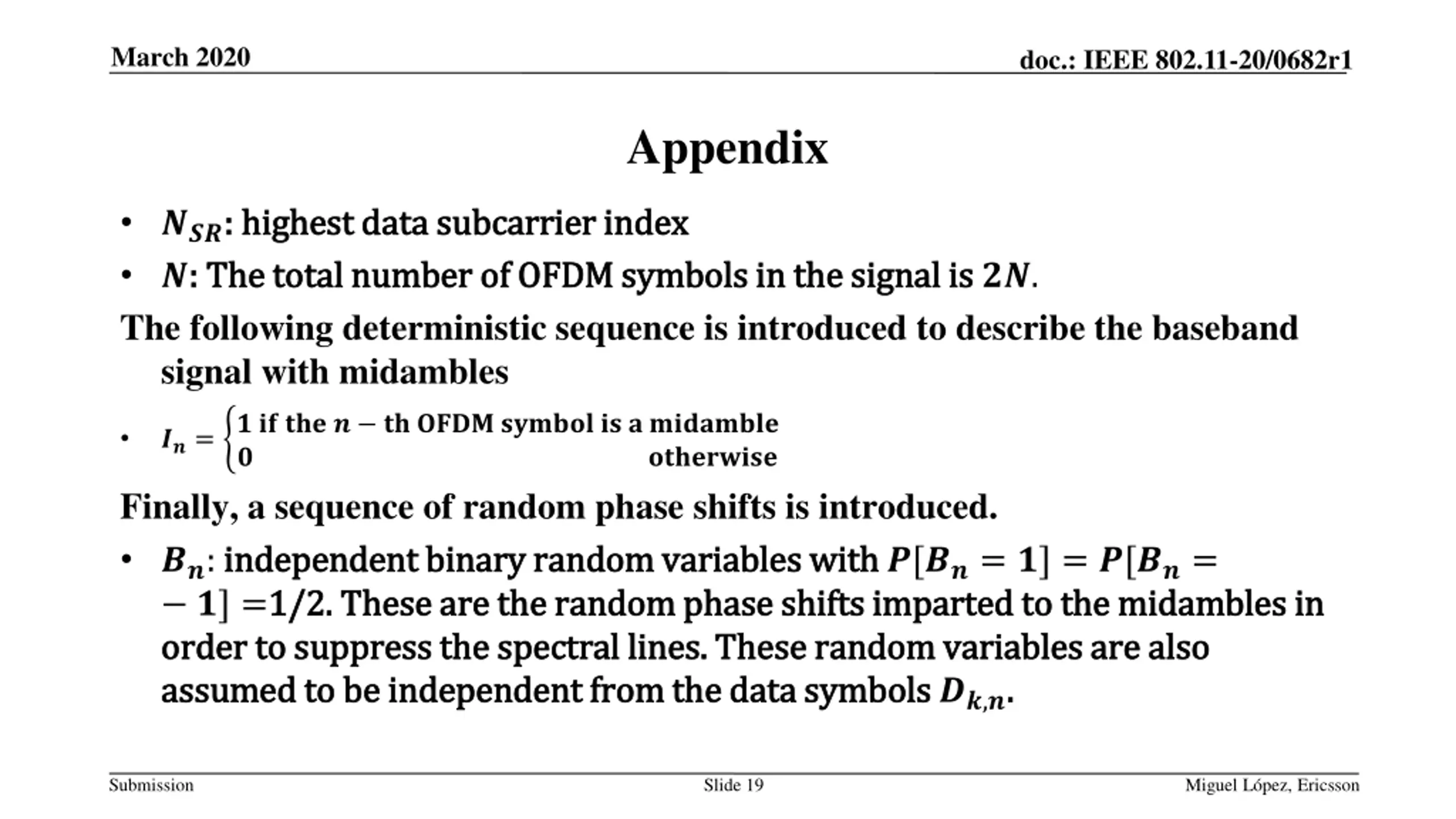 March 2020 doc.: IEEE 802.11-20/0682r1 Appendix ???: highest data subcarrier index : highest data subcarrier index ?: The total number of OFDM symbols in the signal is : The total number of OFDM symbols in the signal is ??. The following deterministic sequence is introduced to describe the baseband signal with midambles ??= ? ?? ??? ? ?? ???? ?????? ?? ? ???????? ? Finally, a sequence of random phase shifts is introduced. ??: independent binary random variables with independent binary random variables with?[??= ?] = ?[??= ?] =1/2. These are the random phase shifts imparted to the midambles in 1/2. These are the random phase shifts imparted to the midambles in order to suppress the spectral lines. These random variables are also order to suppress the spectral lines. These random variables are also assumed to be independent from the data symbols assumed to be independent from the data symbols ??,?. . ????????? Submission Slide 19 Miguel L pez, Ericsson