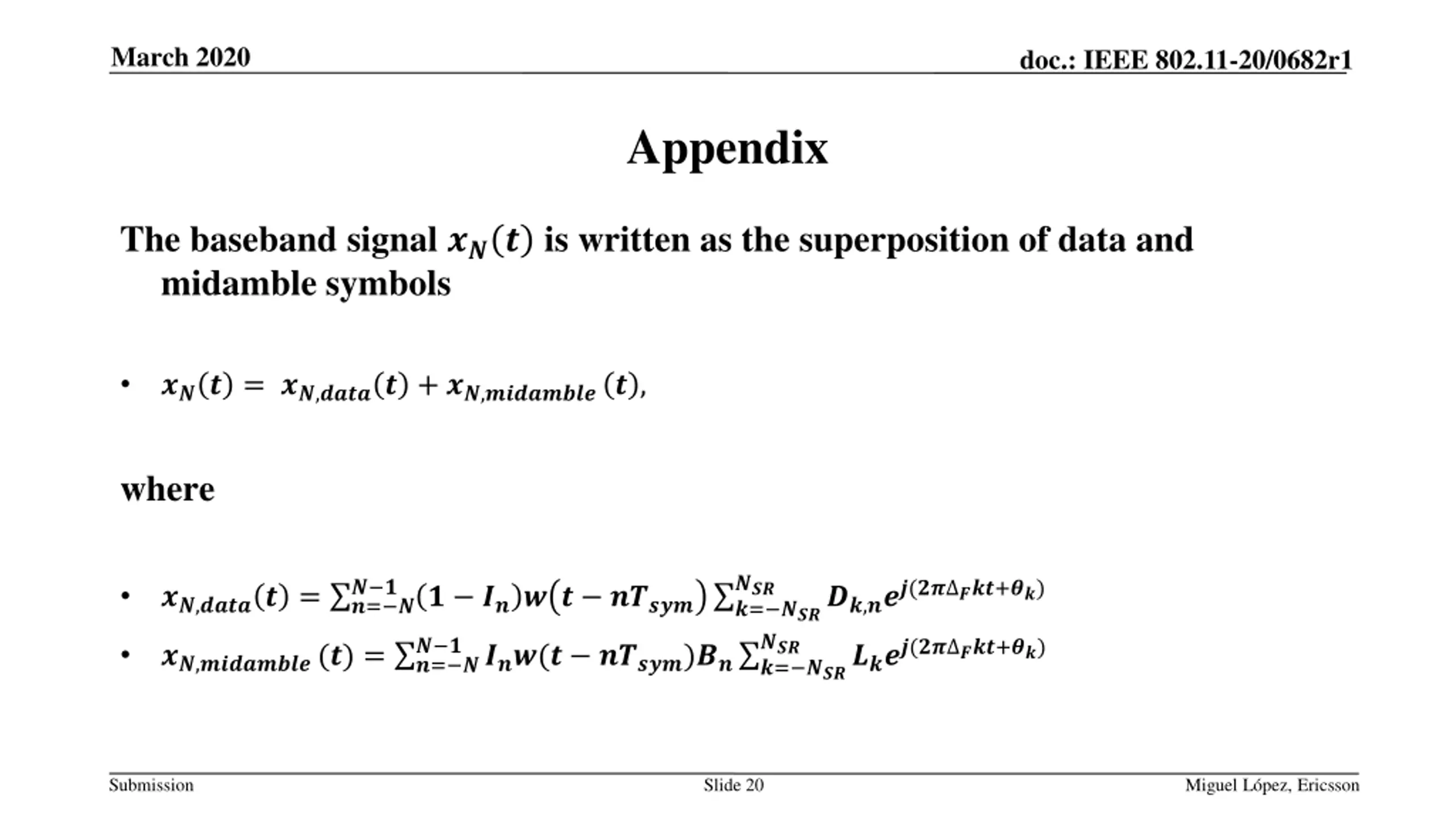 March 2020 doc.: IEEE 802.11-20/0682r1 Appendix The baseband signal ??? is written as the superposition of data and midamble symbols ??? = ??,????? + ??,????????? , where ??? ? ? ??,???(?? ???+??) ??,????? = ?= ? ? ??? ? ????? ?= ??? ? ????(? ?????)?? ?= ??? ??? ????(?? ???+??) ??,????????(?) = ?= ? Submission Slide 20 Miguel L pez, Ericsson