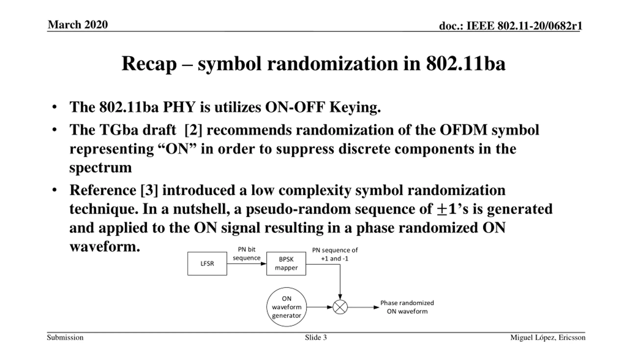 March 2020 doc.: IEEE 802.11-20/0682r1 Recap symbol randomization in 802.11ba The 802.11ba PHY is utilizes ON-OFF Keying. The TGba draft [2] recommends randomization of the OFDM symbol representing ON in order to suppress discrete components in the spectrum Reference [3] introduced a low complexity symbol randomization technique. In a nutshell, a pseudo-random sequence of ? s is generated and applied to the ON signal resulting in a phase randomized ON waveform. BPSK mapper PN bit sequence PN sequence of +1 and -1 LFSR ON Phase randomized ON waveform waveform generator Submission Slide 3 Miguel L pez, Ericsson