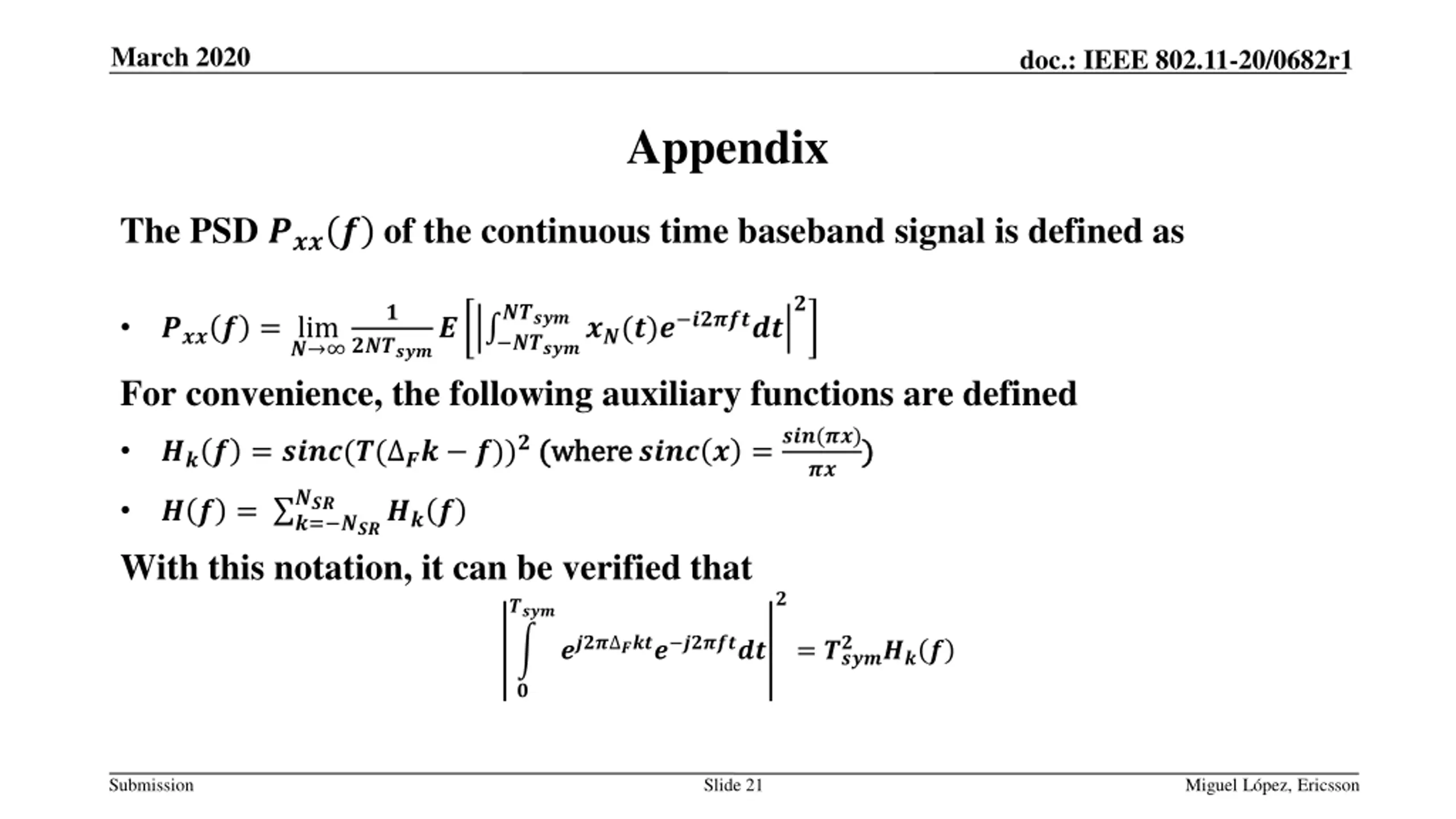 March 2020 doc.: IEEE 802.11-20/0682r1 Appendix The PSD ???? of the continuous time baseband signal is defined as ? ???????(?)? ??????? ? ???? = lim ??????? ????? ? For convenience, the following auxiliary functions are defined (where ???? ? =???(??) ??? = ????(?( ?? ?))?(where ) ) ?? ??? With this notation, it can be verified that ? ? = ?= ??? ??? ? ???? ???? ???? ??????? ? = ???? ??? ? Submission Slide 21 Miguel L pez, Ericsson