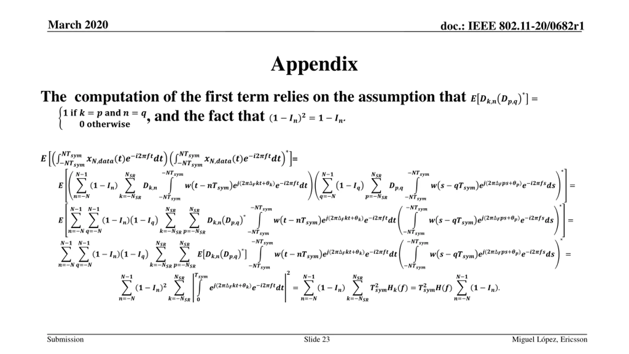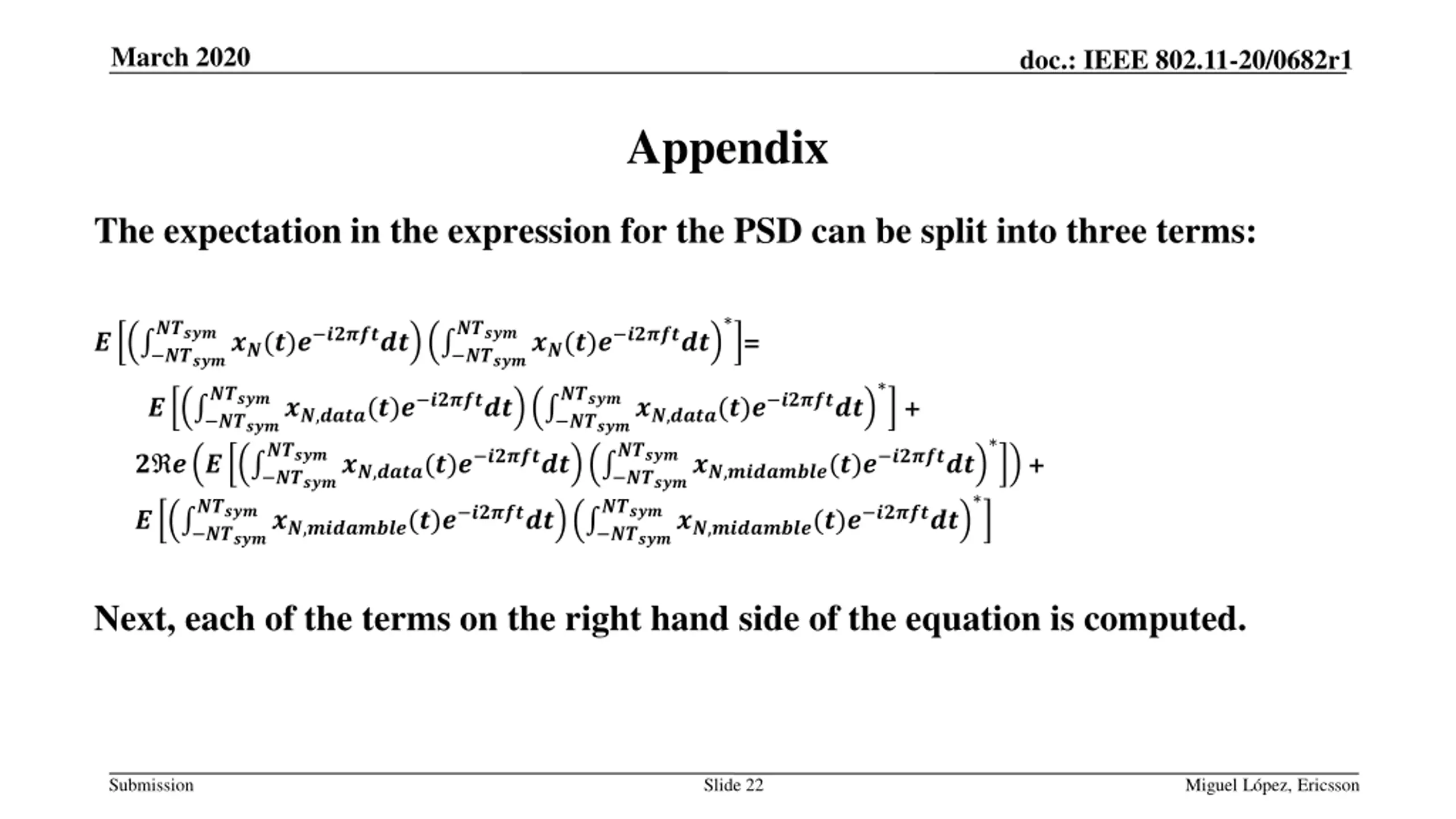 March 2020 doc.: IEEE 802.11-20/0682r1 Appendix The expectation in the expression for the PSD can be split into three terms: ???????(?)? ??????? ???????(?)? ??????? = ? ????? ????? ???????,????(?)? ??????? ???????,????(?)? ??????? + ? ????? ????? ???????,????(?)? ??????? ???????,????????(?)? ??????? + ? ? ? ????? ????? ???????,????????(?)? ??????? ???????,????????(?)? ??????? ? ????? ????? Next, each of the terms on the right hand side of the equation is computed. Submission Slide 22 Miguel L pez, Ericsson
