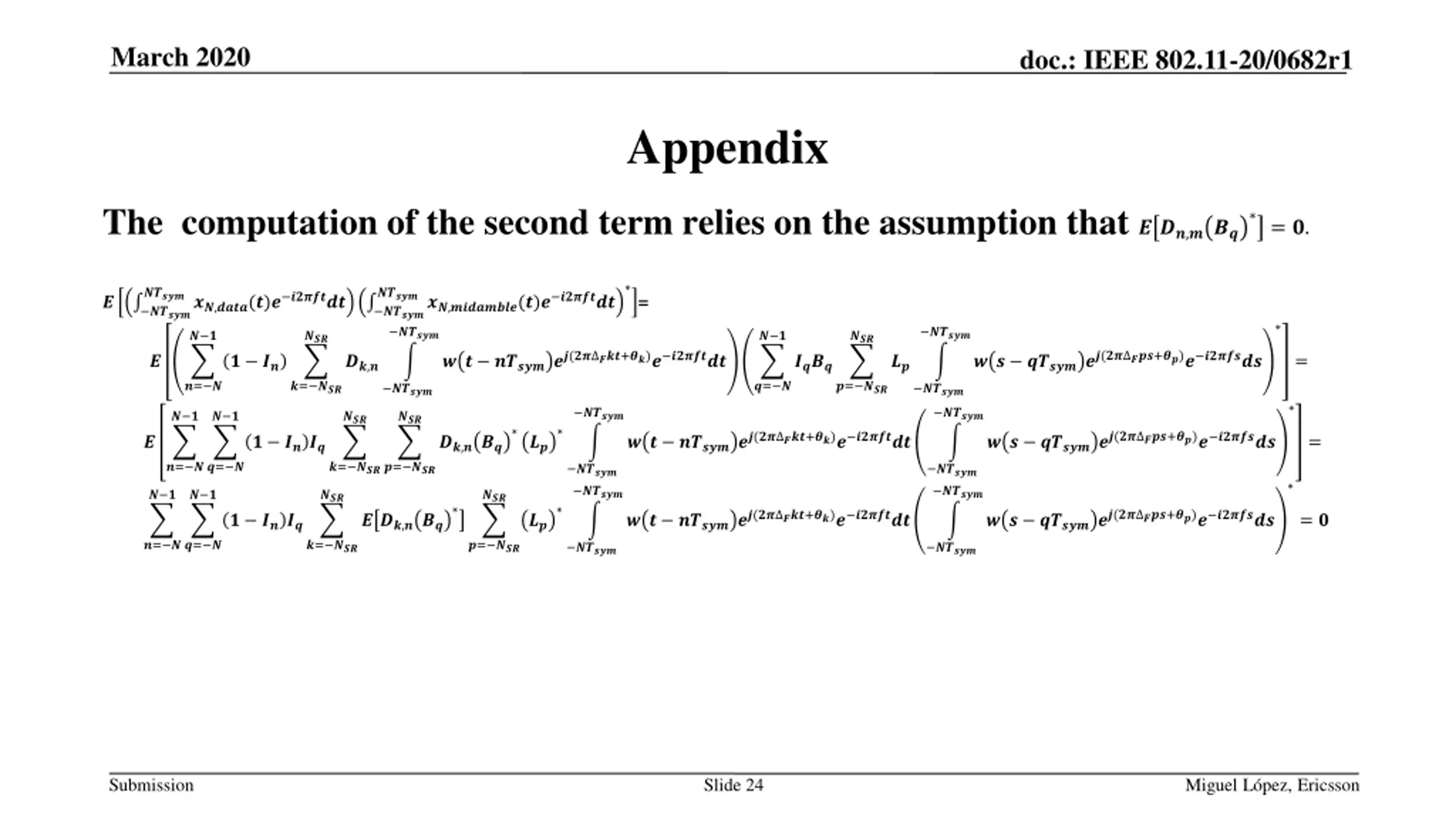 March 2020 doc.: IEEE 802.11-20/0682r1 Appendix The computation of the second term relies on the assumption that ? ??,??? = ?. ???????,????(?)? ??????? ???????,????????(?)? ??????? = ? ????? ????? ????? ????? ? ? ??? ? ? ??? ? ? ???????(?? ???+??)? ??????? ? ? ???????(?? ???+??)? ??????? ? ? ?? ??,? ???? ?? = ?= ? ?= ??? ?= ? ?= ??? ????? ????? ????? ????? ? ? ? ? ??? ??? ? ? ???????(?? ???+??)? ??????? ? ? ???????(?? ???+??)? ??????? ? ? ???? ??,??? ?? = ?= ? ?= ? ?= ??? ?= ??? ????? ????? ????? ????? ? ? ? ? ??? ??? ? ? ???????(?? ???+??)? ??????? ? ? ???????(?? ???+??)? ??????? ? ???? ? ??,??? ?? = ? ?= ? ?= ? ?= ??? ?= ??? ????? ????? Submission Slide 24 Miguel L pez, Ericsson