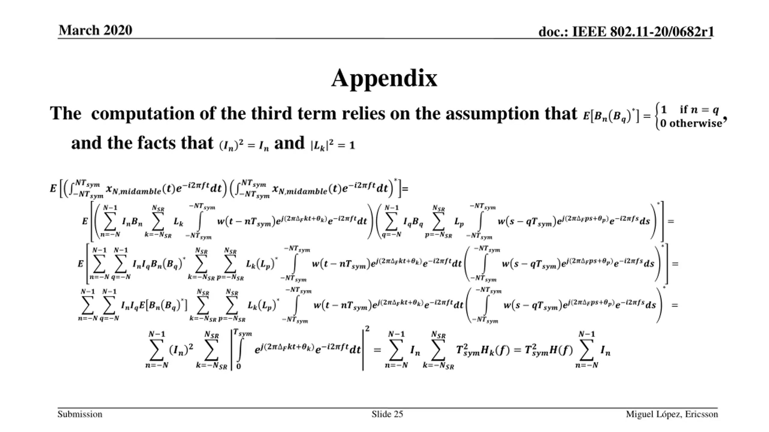 March 2020 doc.: IEEE 802.11-20/0682r1 Appendix The computation of the third term relies on the assumption that ? ???? and the facts that ?? ? ?????????, = ? ?? ? = ? ?= ??and ?? ?= ? ???????,????????(?)? ??????? ???????,????????(?)? ??????? = ? ????? ????? ????? ????? ? ? ??? ? ? ??? ? ? ???????(?? ???+??)? ??????? ? ? ???????(?? ???+??)? ??????? ? ???? ?? ???? ?? = ?= ? ?= ??? ?= ? ?= ??? ????? ????? ????? ????? ? ? ? ? ??? ??? ? ? ???????(?? ???+??)? ??????? ? ? ???????(?? ???+??)? ??????? ? ???????? ???? = ?= ? ?= ? ?= ??? ?= ??? ????? ????? ????? ????? ? ? ? ? ??? ??? ? ? ???????(?? ???+??)? ??????? ? ? ???????(?? ???+??)? ??????? ????? ???? ???? = ?= ? ?= ? ?= ??? ?= ??? ????? ????? ? ???? ? ? ??? ? ? ??? ? ? ? ??(?? ???+??)? ??????? ? ? ?? = ?? ???? ??(?) = ???? ?(?) ?? ?= ? ?= ??? ?= ? ?= ??? ?= ? ? Submission Slide 25 Miguel L pez, Ericsson