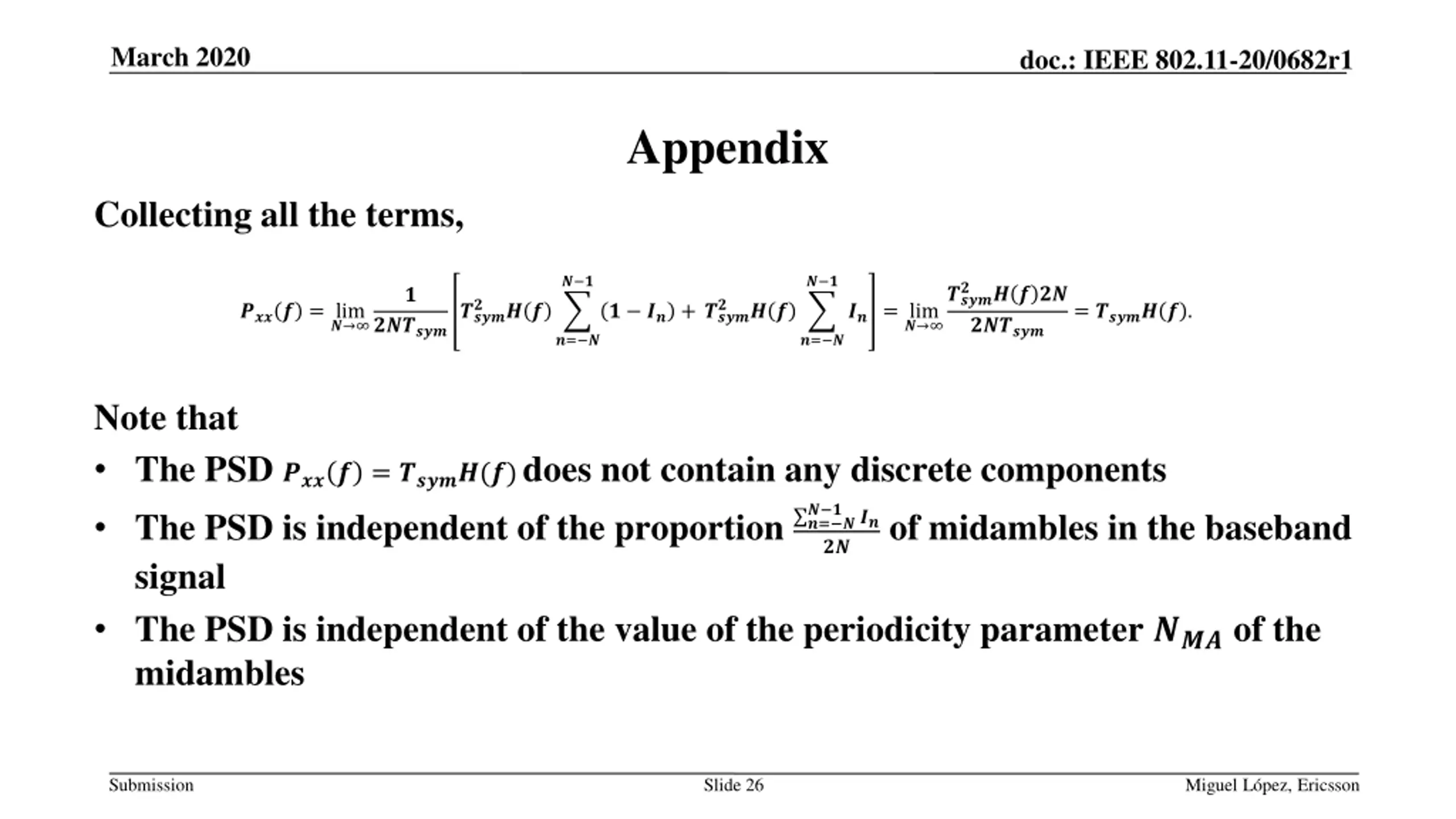 March 2020 doc.: IEEE 802.11-20/0682r1 Appendix Collecting all the terms, ? ? ? ? ? ???? ? ? ?? ?????? ? ? ? ???? = lim ???? ? ? ? ?? + ???? ? ? ?? = lim = ????? ? . ?????? ? ? ?= ? ?= ? Note that The PSD ???? = ?????(?)does not contain any discrete components The PSD is independent of the proportion ?= ? signal The PSD is independent of the value of the periodicity parameter ???of the midambles ? ? of midambles in the baseband ?? ?? Submission Slide 26 Miguel L pez, Ericsson