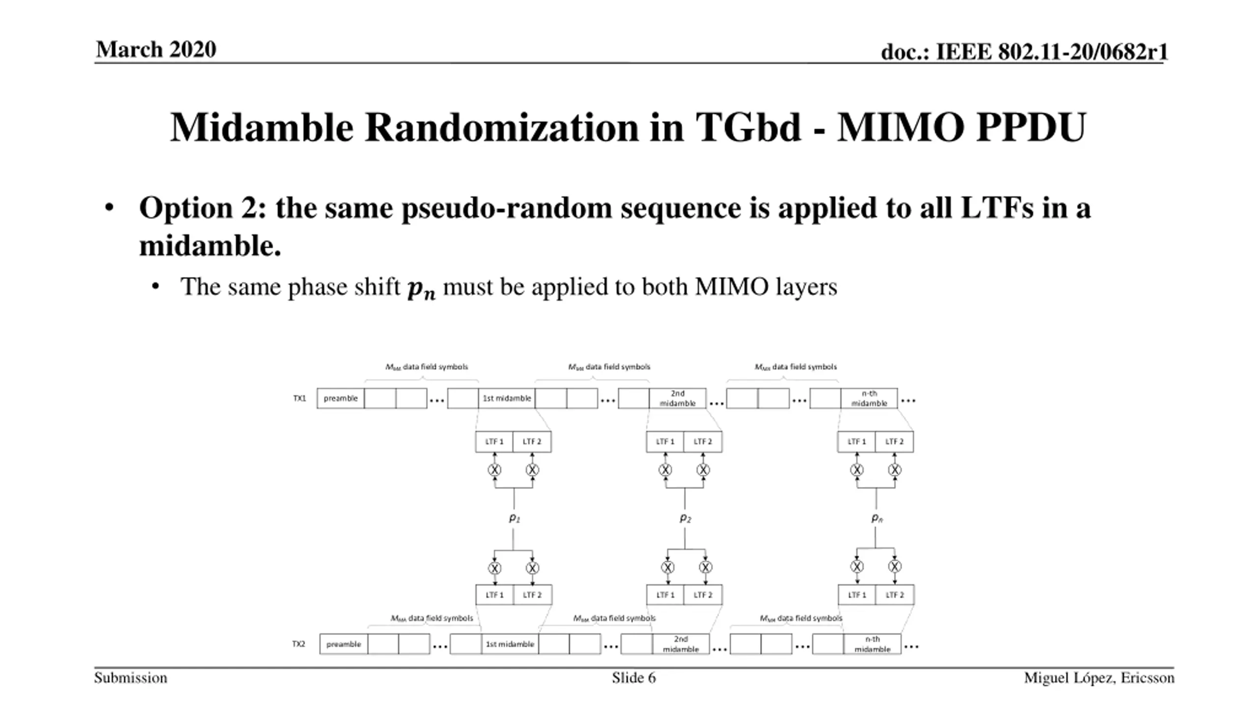 March 2020 doc.: IEEE 802.11-20/0682r1 Midamble Randomization in TGbd - MIMO PPDU In case of MIMO PPDUs there are two alternatives Option 1: different pseudo-random sequences are applied to the LTFs in a midamble The same phase shift ??must be applied to both layers MMA data field symbols MMA data field symbols MMA data field symbols ... ... ... ... ... 2nd n-th TX1 preamble 1st midamble midamble midamble LTF 1 LTF 2 LTF 1 LTF 2 LTF 1 LTF 2 X X X X X X p3 p1 p2n-1 p4 p2 p2n LTF 1 LTF 2 LTF 1 LTF 2 LTF 1 LTF 2 MMA data field symbols MMA data field symbols MMA data field symbols ... ... ... midamble... midamble ... 2nd n-th TX2 preamble 1st midamble Submission Slide 5 Miguel L pez, Ericsson