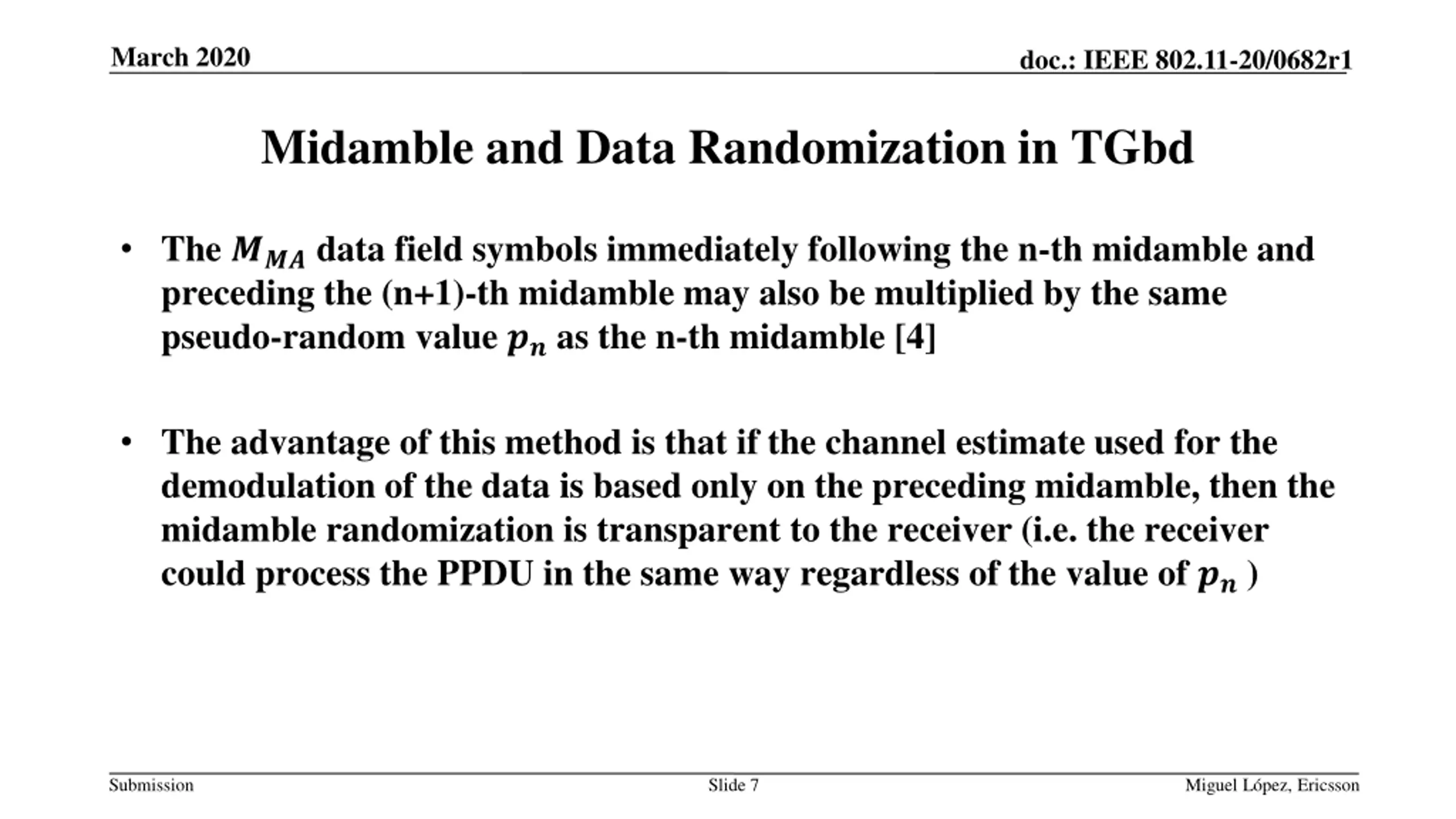 March 2020 doc.: IEEE 802.11-20/0682r1 Midamble and Data Randomization in TGbd The ???data field symbols immediately following the n-th midamble and preceding the (n+1)-th midamble may also be multiplied by the same pseudo-random value ??as the n-th midamble [4] The advantage of this method is that if the channel estimate used for the demodulation of the data is based only on the preceding midamble, then the midamble randomization is transparent to the receiver (i.e. the receiver could process the PPDU in the same way regardless of the value of ??) Submission Slide 7 Miguel L pez, Ericsson