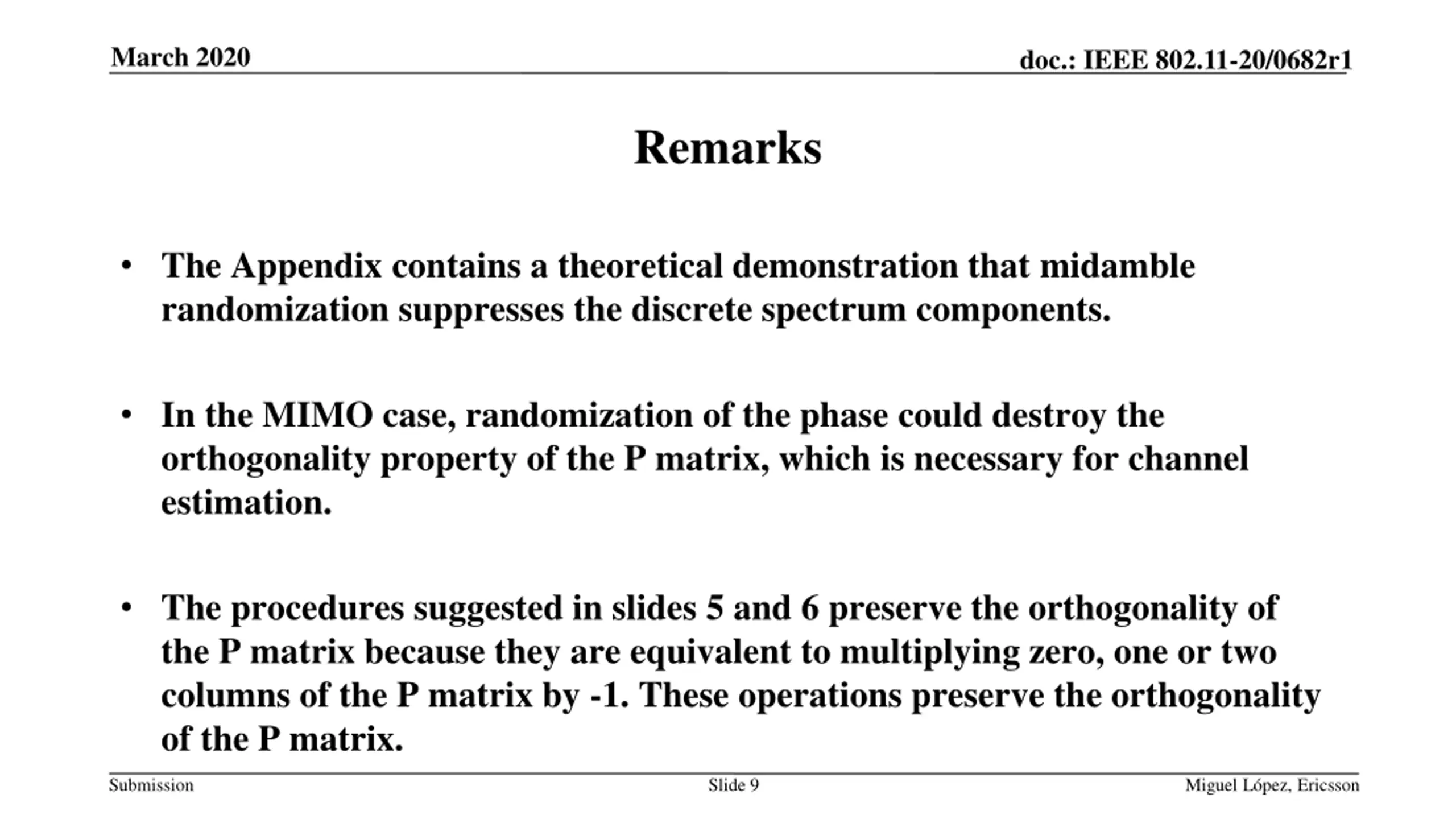 March 2020 doc.: IEEE 802.11-20/0682r1 Remarks The Appendix contains a theoretical demonstration that midamble randomization suppresses the discrete spectrum components. In the MIMO case, randomization of the phase could destroy the orthogonality property of the P matrix, which is necessary for channel estimation. The procedures suggested in slides 5 and 6 preserve the orthogonality of the P matrix because they are equivalent to multiplying zero, one or two columns of the P matrix by -1. These operations preserve the orthogonality of the P matrix. Submission Slide 9 Miguel L pez, Ericsson