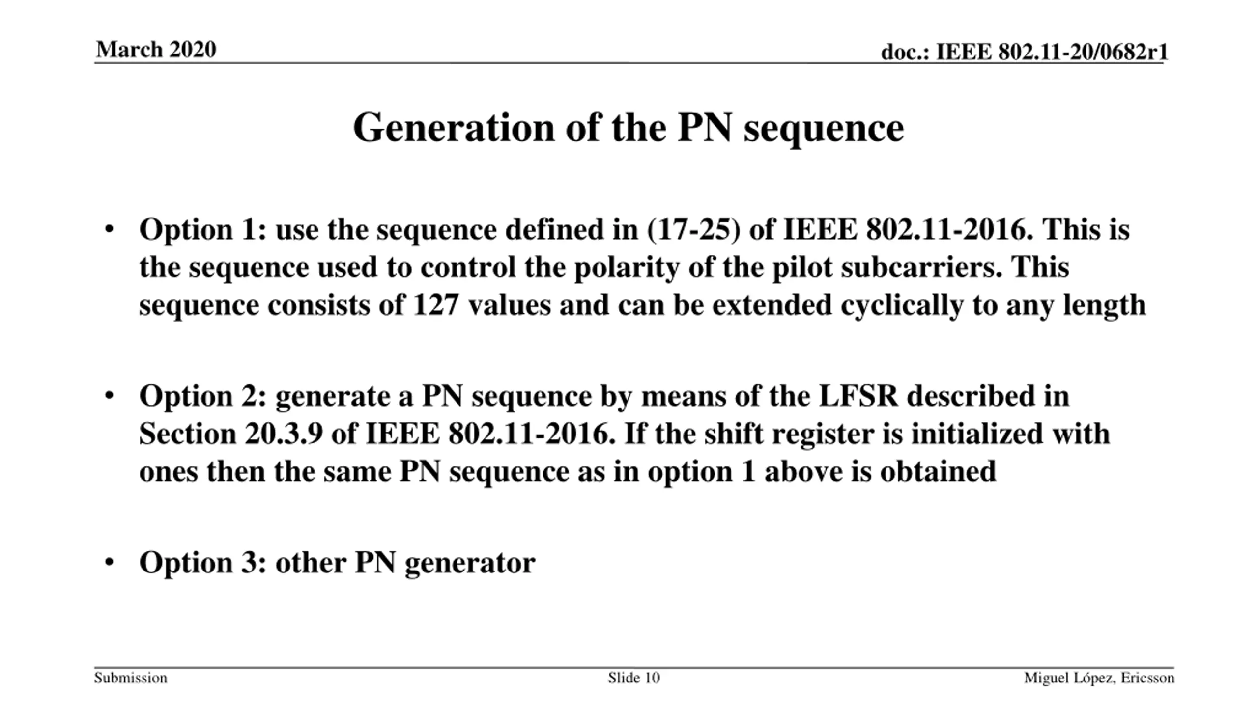 March 2020 doc.: IEEE 802.11-20/0682r1 Generation of the PN sequence Option 1: use the sequence defined in (17-25) of IEEE 802.11-2016. This is the sequence used to control the polarity of the pilot subcarriers. This sequence consists of 127 values and can be extended cyclically to any length Option 2: generate a PN sequence by means of the LFSR described in Section 20.3.9 of IEEE 802.11-2016. If the shift register is initialized with ones then the same PN sequence as in option 1 above is obtained Option 3: other PN generator Submission Slide 10 Miguel L pez, Ericsson