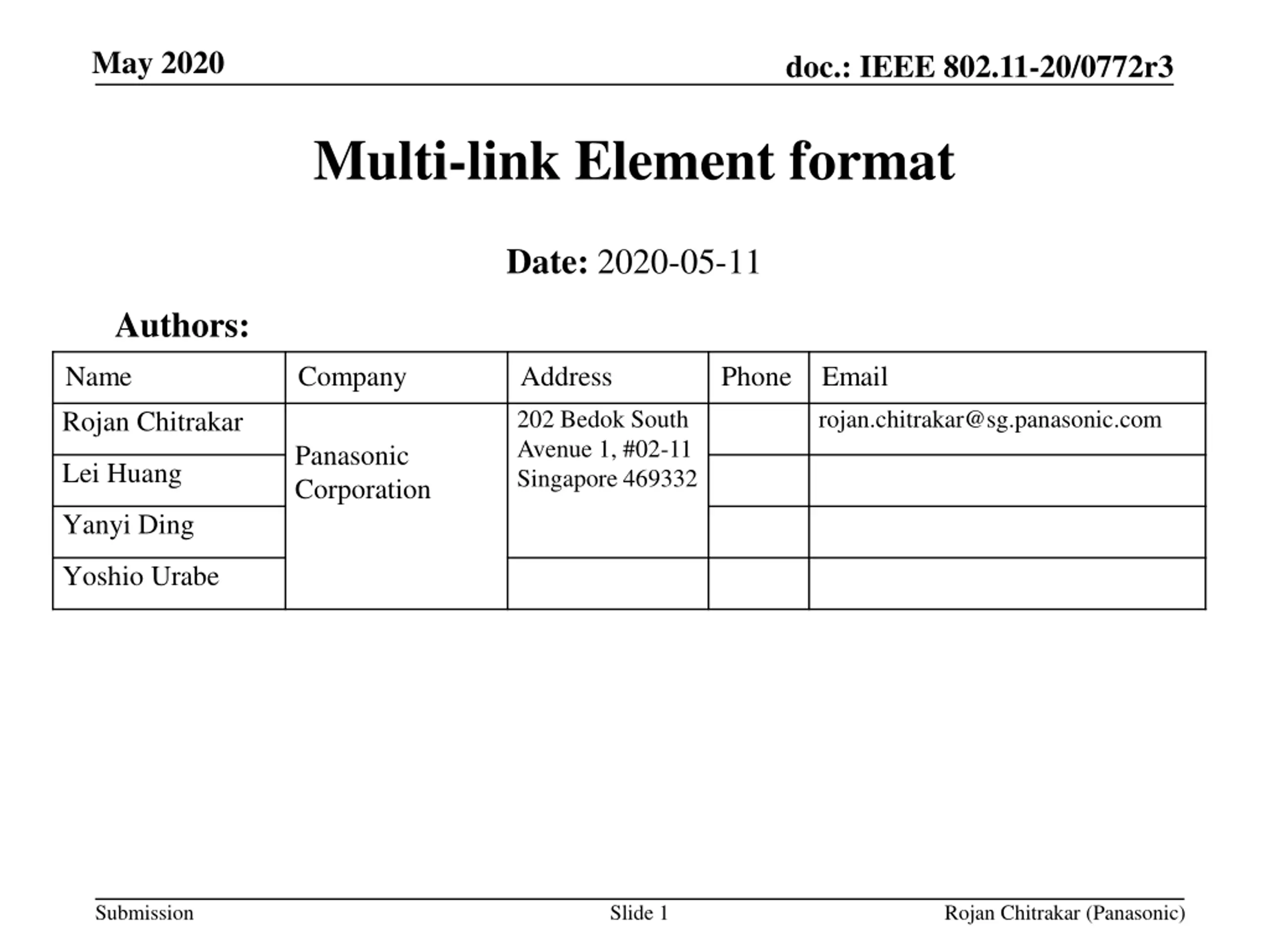 May 2020 doc.: IEEE 802.11-20/0772r3 Multi-link Element format Date: 2020-05-11 Authors: Name Rojan Chitrakar Company Address Phone Email 202 Bedok South Avenue 1, #02-11 Singapore 469332 rojan.chitrakar@sg.panasonic.com Panasonic Corporation Lei Huang Yanyi Ding Yoshio Urabe Submission Slide 1 Rojan Chitrakar (Panasonic)