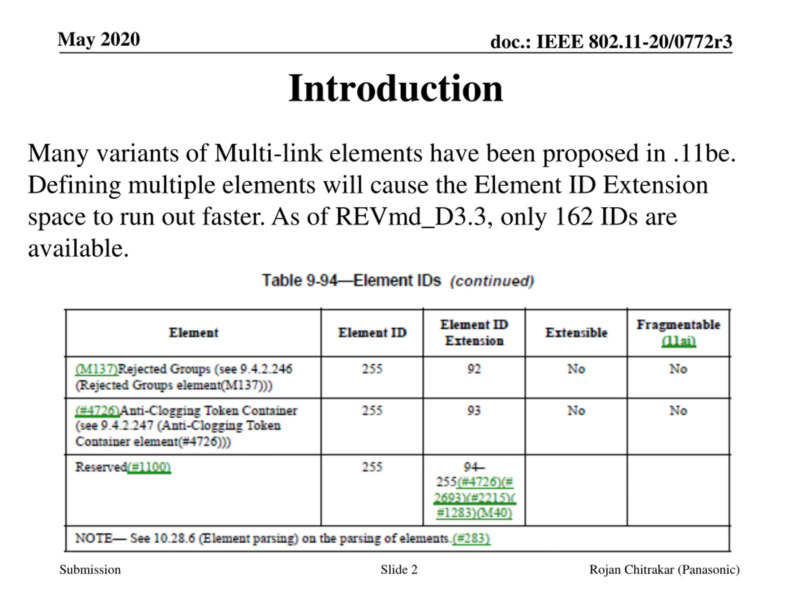 May 2020 doc.: IEEE 802.11-20/0772r3 Introduction Many variants of Multi-link elements have been proposed in .11be. Defining multiple elements will cause the Element ID Extension space to run out faster. As of REVmd_D3.3, only 162 IDs are available. Submission Slide 2 Rojan Chitrakar (Panasonic)