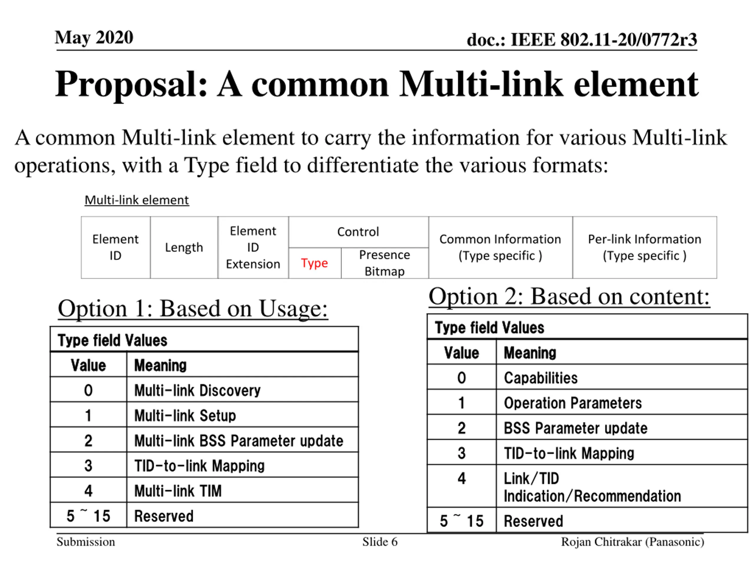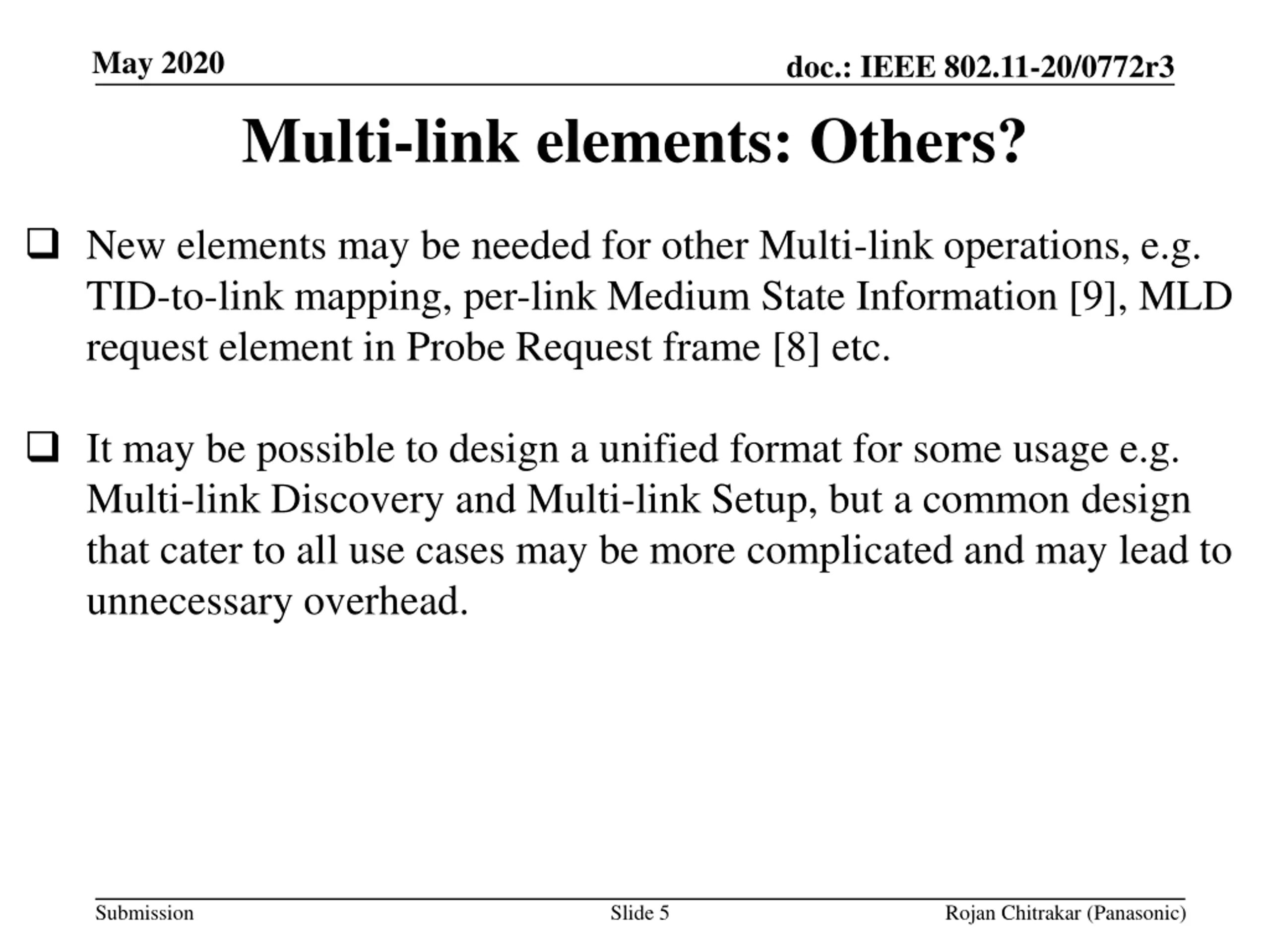 May 2020 doc.: IEEE 802.11-20/0772r3 Multi-link elements: Others? New elements may be needed for other Multi-link operations, e.g. TID-to-link mapping, per-link Medium State Information [9], MLD request element in Probe Request frame [8] etc. It may be possible to design a unified format for some usage e.g. Multi-link Discovery and Multi-link Setup, but a common design that cater to all use cases may be more complicated and may lead to unnecessary overhead. Submission Slide 5 Rojan Chitrakar (Panasonic)