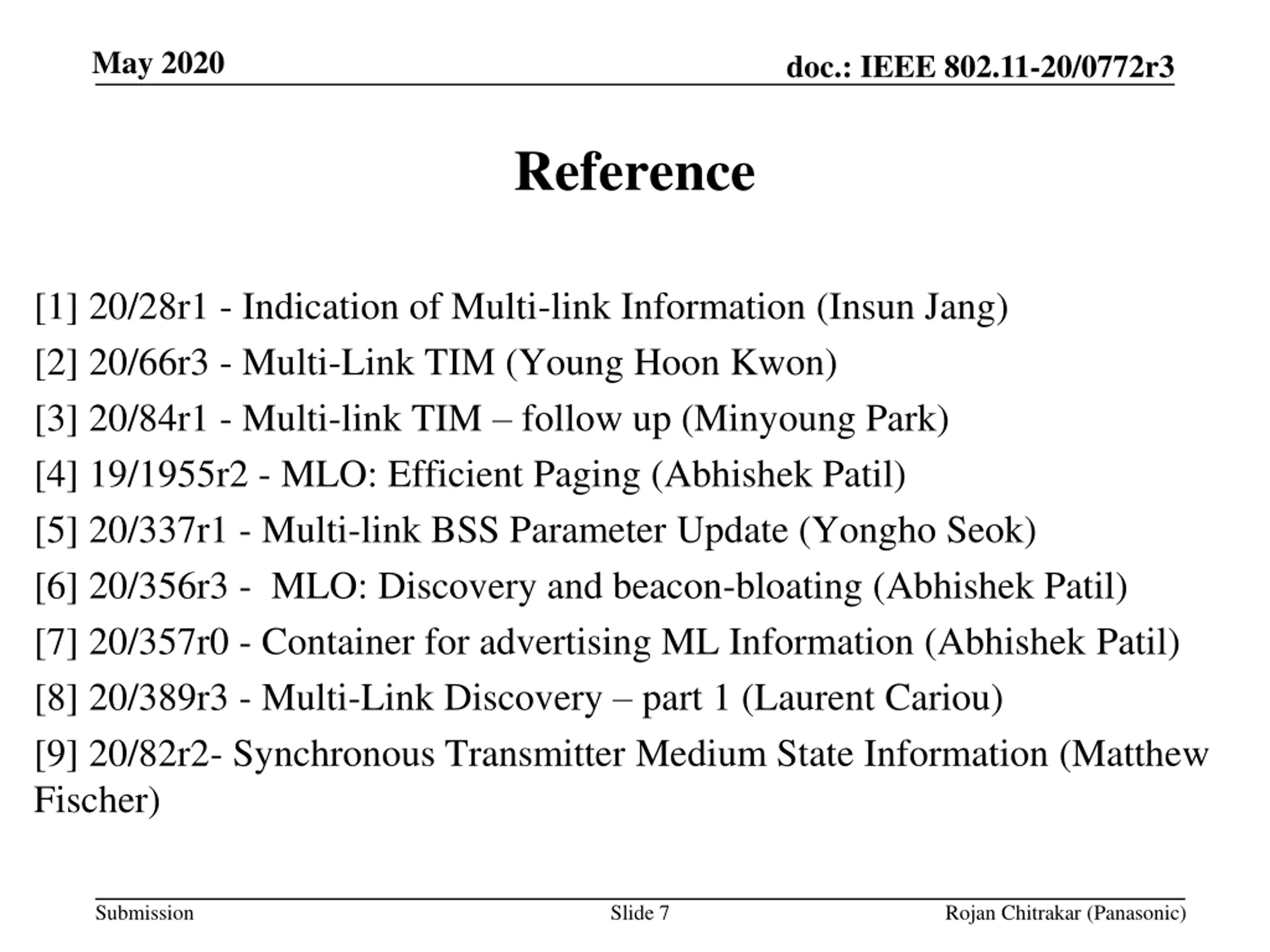 May 2020 doc.: IEEE 802.11-20/0772r3 Reference [1] 20/28r1 - Indication of Multi-link Information (Insun Jang) [2] 20/66r3 - Multi-Link TIM (Young Hoon Kwon) [3] 20/84r1 - Multi-link TIM follow up (Minyoung Park) [4] 19/1955r2 - MLO: Efficient Paging (Abhishek Patil) [5] 20/337r1 - Multi-link BSS Parameter Update (Yongho Seok) [6] 20/356r3 - MLO: Discovery and beacon-bloating (Abhishek Patil) [7] 20/357r0 - Container for advertising ML Information (Abhishek Patil) [8] 20/389r3 - Multi-Link Discovery part 1 (Laurent Cariou) [9] 20/82r2- Synchronous Transmitter Medium State Information (Matthew Fischer) Submission Slide 7 Rojan Chitrakar (Panasonic)