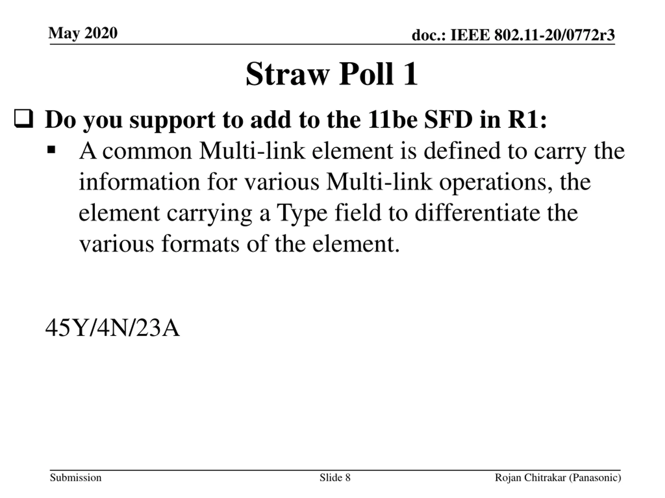 May 2020 doc.: IEEE 802.11-20/0772r3 Straw Poll 1 Do you support to add to the 11be SFD in R1: A common Multi-link element is defined to carry the information for various Multi-link operations, the element carrying a Type field to differentiate the various formats of the element. 45Y/4N/23A Submission Slide 8 Rojan Chitrakar (Panasonic)