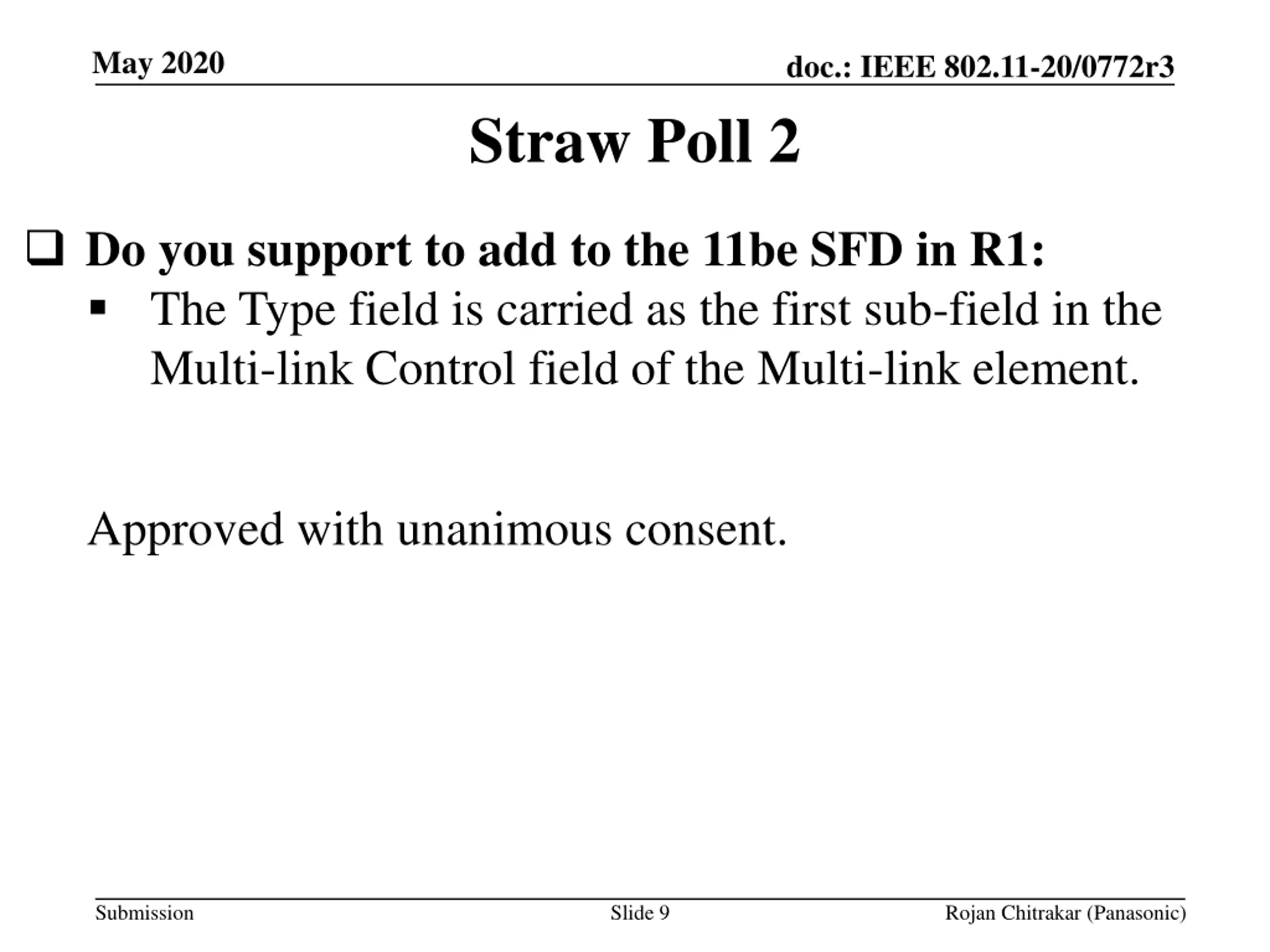 May 2020 doc.: IEEE 802.11-20/0772r3 Straw Poll 2 Do you support to add to the 11be SFD in R1: The Type field is carried as the first sub-field in the Multi-link Control field of the Multi-link element. Approved with unanimous consent. Submission Slide 9 Rojan Chitrakar (Panasonic)