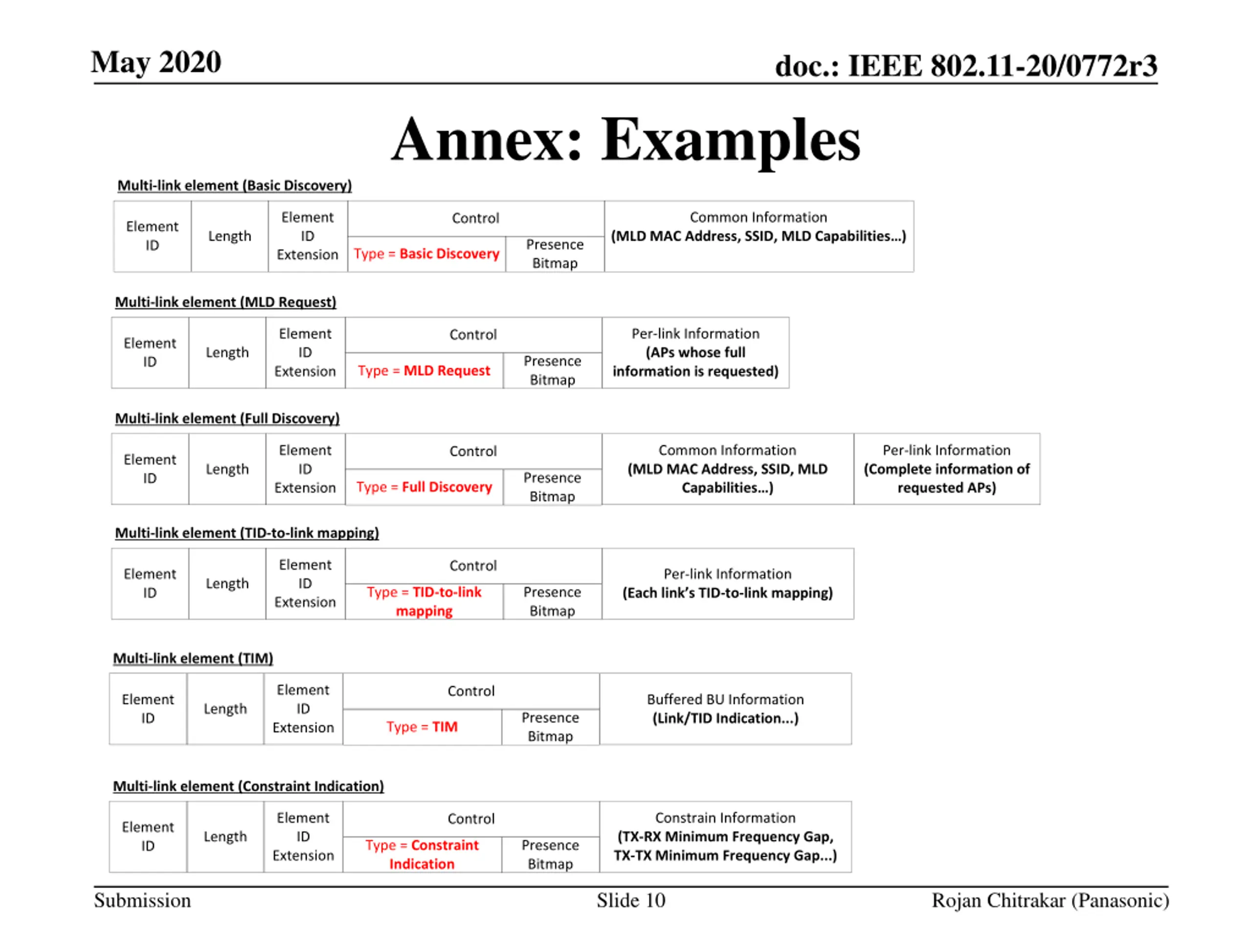 May 2020 doc.: IEEE 802.11-20/0772r3 Annex: Examples Multi-link element (Basic Discovery) Element ID Extension Common Information Control Element ID Length (MLD MAC Address, SSID, MLD Capabilities ) Presence Bitmap Type = Basic Discovery Multi-link element (MLD Request) Element ID Extension Per-link Information (APs whose full information is requested) Control Element ID Length Presence Bitmap Type = MLD Request Multi-link element (Full Discovery) Element ID Extension Common Information (MLD MAC Address, SSID, MLD Capabilities ) Per-link Information (Complete information of requested APs) Control Element ID Length Presence Bitmap Type = Full Discovery Multi-link element (TID-to-link mapping) Element ID Extension Control Element ID Per-link Information (Each link s TID-to-link mapping) Length Type = TID-to-link mapping Presence Bitmap Multi-link element (TIM) Element ID Extension Control Element ID Buffered BU Information (Link/TID Indication...) Length Presence Bitmap Type = TIM Multi-link element (Constraint Indication) Element ID Extension Constrain Information (TX-RX Minimum Frequency Gap, TX-TX Minimum Frequency Gap...) Control Element ID Length Type = Constraint Indication Presence Bitmap Submission Slide 10 Rojan Chitrakar (Panasonic)