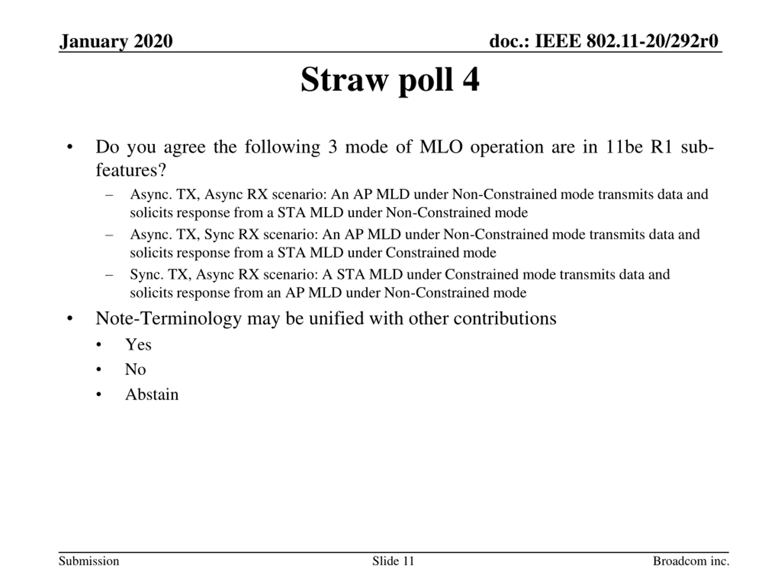 doc.: IEEE 802.11-20/292r0 January 2020 Straw poll 4 Do you agree the following 3 mode of MLO operation are in 11be R1 sub- features? Async. TX, Async RX scenario: An AP MLD under Non-Constrained mode transmits data and solicits response from a STA MLD under Non-Constrained mode Async. TX, Sync RX scenario: An AP MLD under Non-Constrained mode transmits data and solicits response from a STA MLD under Constrained mode Sync. TX, Async RX scenario: A STA MLD under Constrained mode transmits data and solicits response from an AP MLD under Non-Constrained mode Note-Terminology may be unified with other contributions Yes No Abstain Submission Slide 11 Broadcom inc.