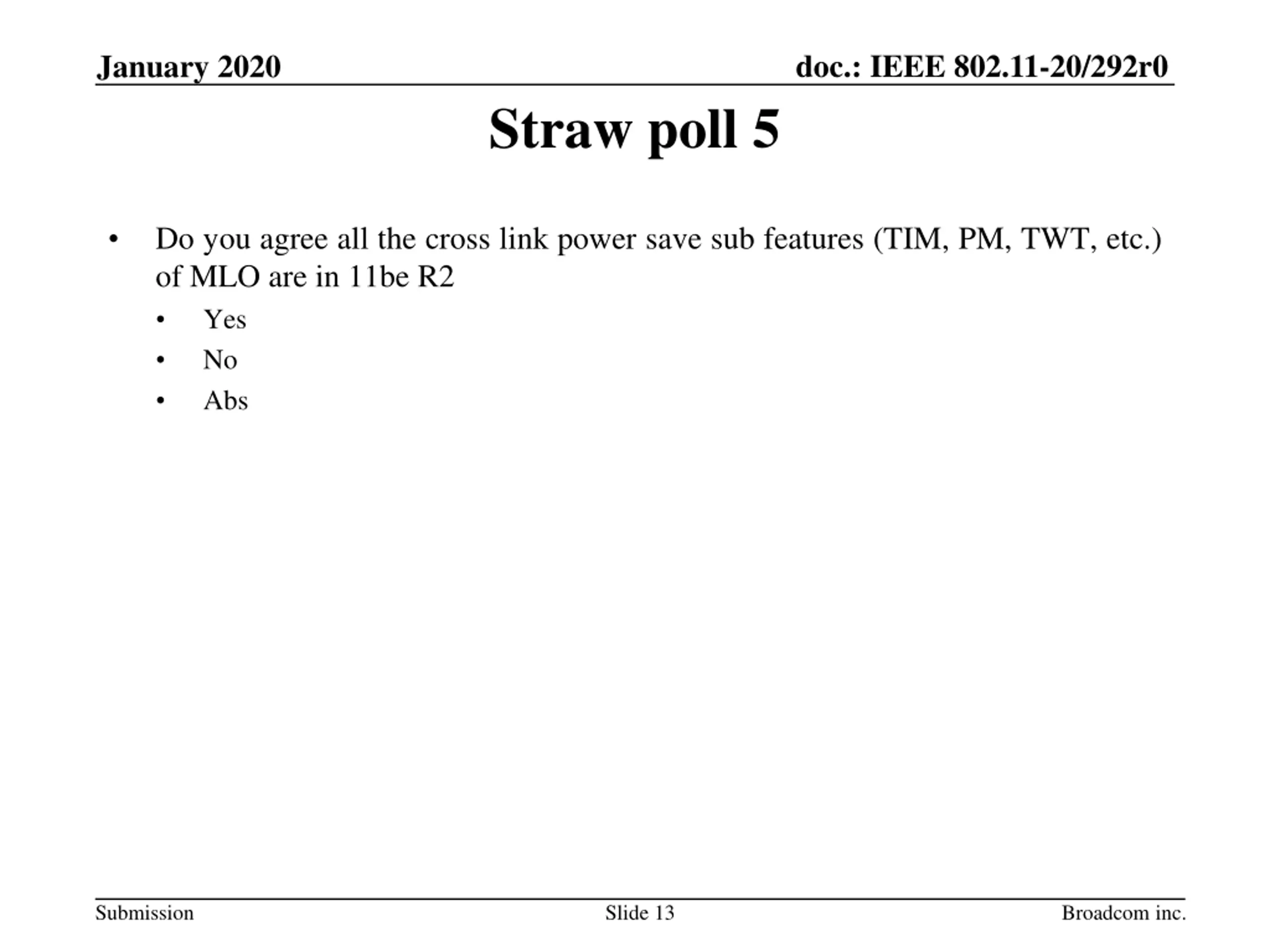 doc.: IEEE 802.11-20/292r0 January 2020 Straw poll 5 Do you agree all the cross link power save sub features (TIM, PM, TWT, etc.) of MLO are in 11be R2 Yes No Abs Submission Slide 13 Broadcom inc.