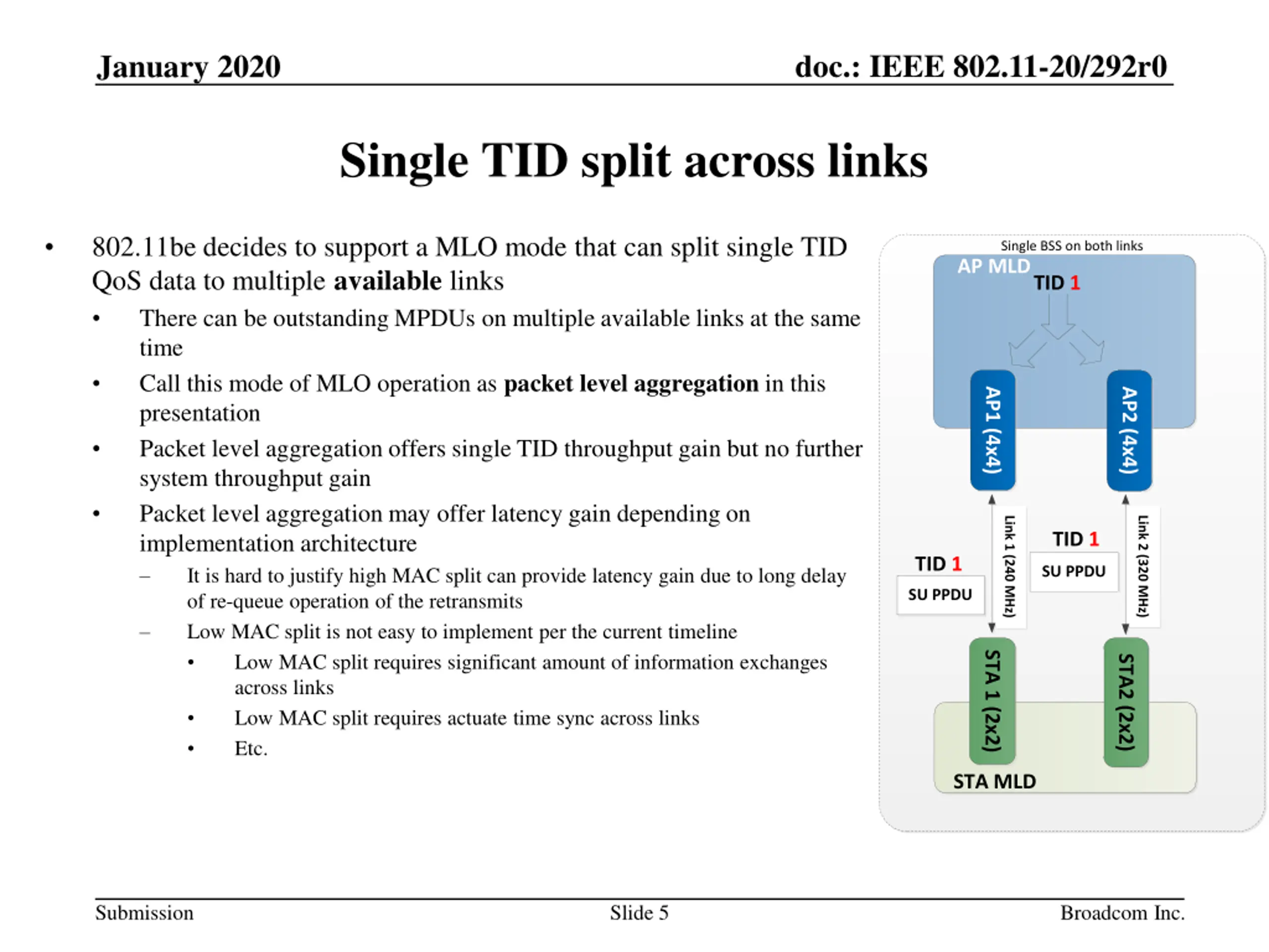 doc.: IEEE 802.11-20/292r0 January 2020 Single TID split across links 802.11be decides to support a MLO mode that can split single TID QoS data to multiple available links There can be outstanding MPDUs on multiple available links at the same time Call this mode of MLO operation as packet level aggregation in this presentation Packet level aggregation offers single TID throughput gain but no further system throughput gain Packet level aggregation may offer latency gain depending on implementation architecture It is hard to justify high MAC split can provide latency gain due to long delay of re-queue operation of the retransmits Low MAC split is not easy to implement per the current timeline Low MAC split requires significant amount of information exchanges across links Low MAC split requires actuate time sync across links Etc. Single BSS on both links AP MLD TID 1 AP1 (4x4) AP2 (4x4) Link 2 (320 MHz) Link 1 (240 MHz) TID 1 TID 1 SU PPDU SU PPDU STA 1 (2x2) STA2 (2x2) STA MLD Submission Slide 5 Broadcom Inc.