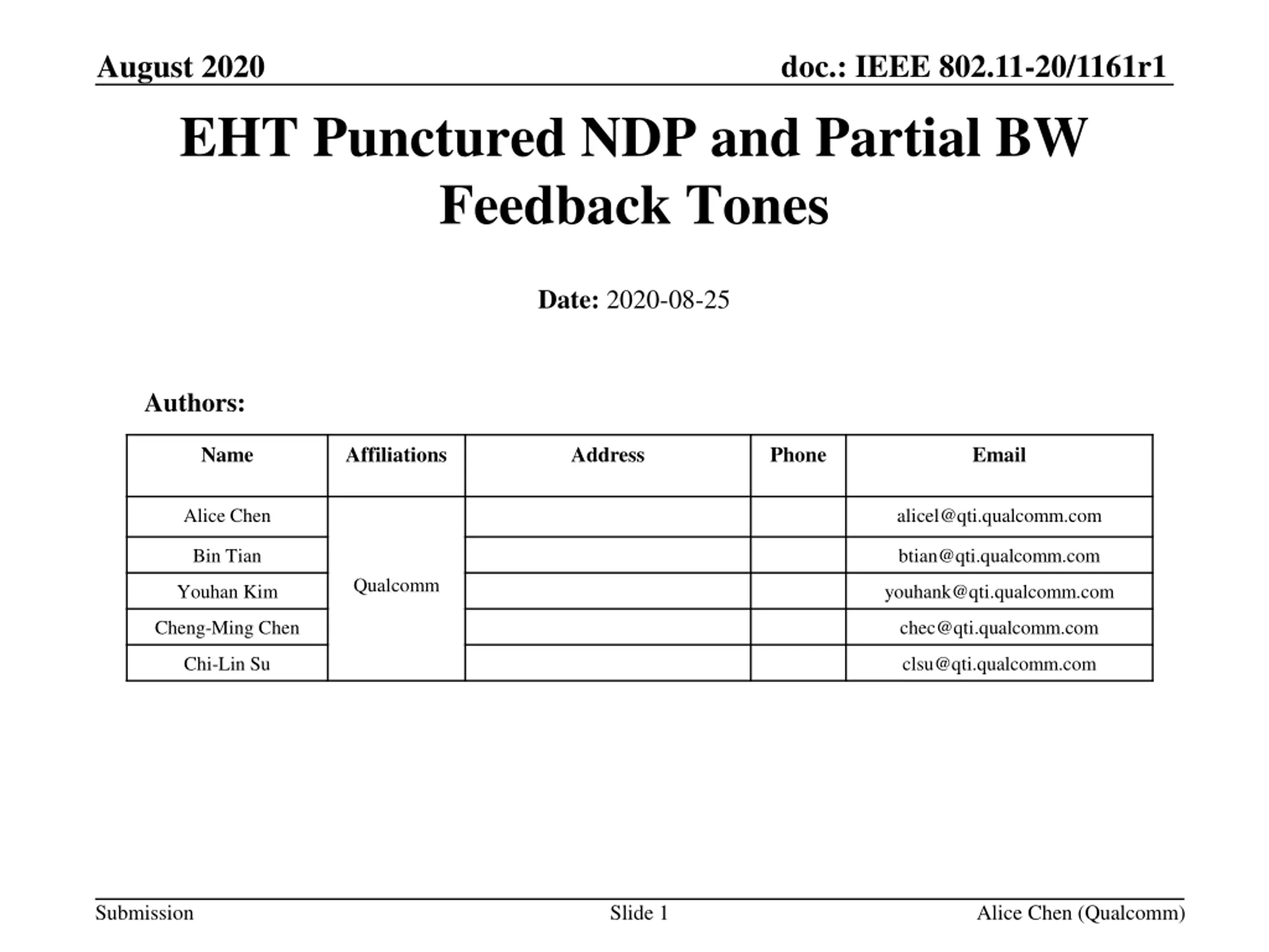 doc.: IEEE 802.11-20/1161r1 August 2020 EHT Punctured NDP and Partial BW Feedback Tones Date: 2020-08-25 Authors: Name Affiliations Address Phone Email Alice Chen alicel@qti.qualcomm.com Bin Tian btian@qti.qualcomm.com Qualcomm Youhan Kim youhank@qti.qualcomm.com Cheng-Ming Chen chec@qti.qualcomm.com Chi-Lin Su clsu@qti.qualcomm.com Submission Slide 1 Alice Chen (Qualcomm)