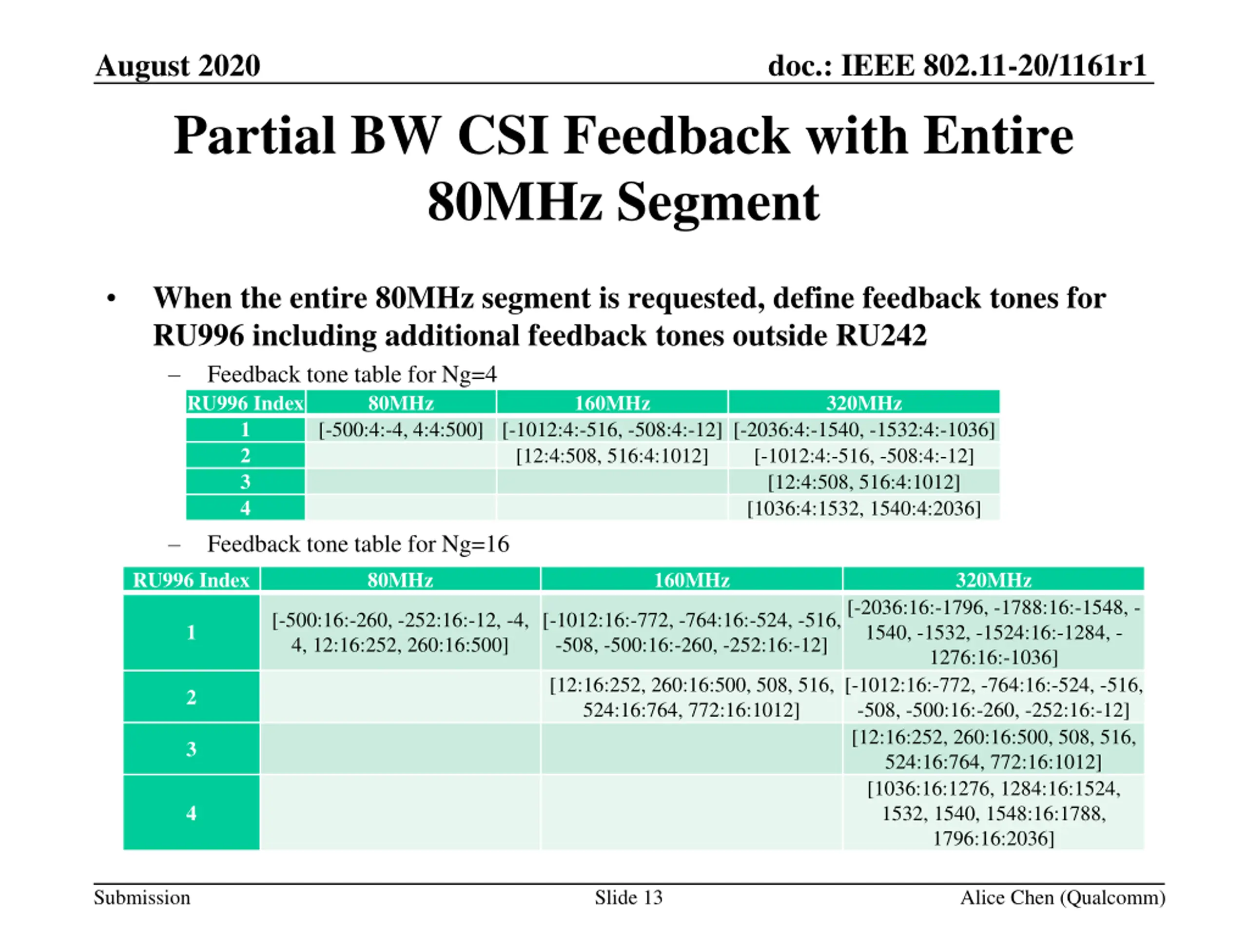 doc.: IEEE 802.11-20/1161r1 August 2020 Partial BW CSI Feedback with Entire 80MHz Segment When the entire 80MHz segment is requested, define feedback tones for RU996 including additional feedback tones outside RU242 Feedback tone table for Ng=4 RU996 Index 80MHz 160MHz 1 [-500:4:-4, 4:4:500] [-1012:4:-516, -508:4:-12] [-2036:4:-1540, -1532:4:-1036] 2 [12:4:508, 516:4:1012] 3 4 320MHz [-1012:4:-516, -508:4:-12] [12:4:508, 516:4:1012] [1036:4:1532, 1540:4:2036] Feedback tone table for Ng=16 RU996 Index 80MHz 160MHz 320MHz [-2036:16:-1796, -1788:16:-1548, - 1540, -1532, -1524:16:-1284, - 1276:16:-1036] [-1012:16:-772, -764:16:-524, -516, -508, -500:16:-260, -252:16:-12] [12:16:252, 260:16:500, 508, 516, 524:16:764, 772:16:1012] [1036:16:1276, 1284:16:1524, 1532, 1540, 1548:16:1788, 1796:16:2036] [-500:16:-260, -252:16:-12, -4, 4, 12:16:252, 260:16:500] [-1012:16:-772, -764:16:-524, -516, -508, -500:16:-260, -252:16:-12] 1 [12:16:252, 260:16:500, 508, 516, 524:16:764, 772:16:1012] 2 3 4 Submission Slide 13 Alice Chen (Qualcomm)