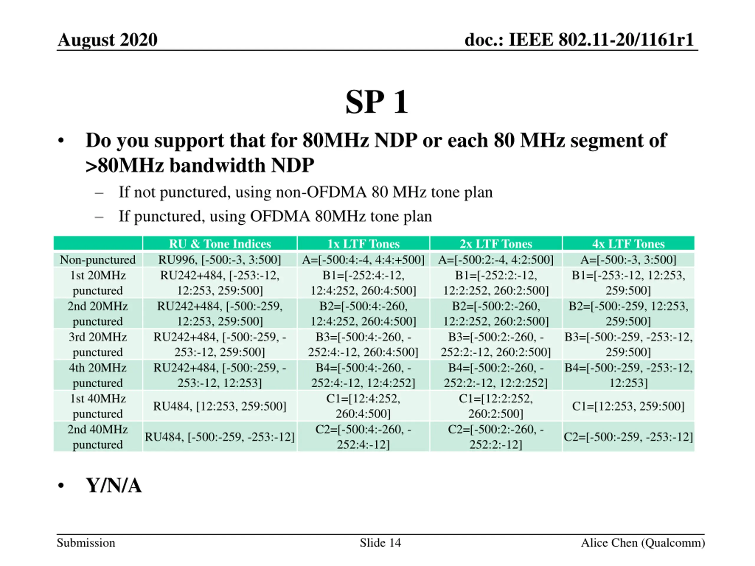 doc.: IEEE 802.11-20/1161r1 August 2020 SP 1 Do you support that for 80MHz NDP or each 80 MHz segment of >80MHz bandwidth NDP If not punctured, using non-OFDMA 80 MHz tone plan If punctured, using OFDMA 80MHz tone plan RU & Tone Indices RU996, [-500:-3, 3:500] RU242+484, [-253:-12, 12:253, 259:500] RU242+484, [-500:-259, 12:253, 259:500] RU242+484, [-500:-259, - 253:-12, 259:500] RU242+484, [-500:-259, - 253:-12, 12:253] 1x LTF Tones A=[-500:4:-4, 4:4:+500] B1=[-252:4:-12, 12:4:252, 260:4:500] B2=[-500:4:-260, 12:4:252, 260:4:500] B3=[-500:4:-260, - 252:4:-12, 260:4:500] B4=[-500:4:-260, - 252:4:-12, 12:4:252] C1=[12:4:252, 260:4:500] C2=[-500:4:-260, - 252:4:-12] 2x LTF Tones A=[-500:2:-4, 4:2:500] B1=[-252:2:-12, 12:2:252, 260:2:500] B2=[-500:2:-260, 12:2:252, 260:2:500] B3=[-500:2:-260, - 252:2:-12, 260:2:500] B4=[-500:2:-260, - 252:2:-12, 12:2:252] C1=[12:2:252, 260:2:500] C2=[-500:2:-260, - 252:2:-12] 4x LTF Tones A=[-500:-3, 3:500] B1=[-253:-12, 12:253, 259:500] B2=[-500:-259, 12:253, 259:500] B3=[-500:-259, -253:-12, 259:500] B4=[-500:-259, -253:-12, 12:253] Non-punctured 1st 20MHz punctured 2nd 20MHz punctured 3rd 20MHz punctured 4th 20MHz punctured 1st 40MHz punctured 2nd 40MHz punctured RU484, [12:253, 259:500] C1=[12:253, 259:500] RU484, [-500:-259, -253:-12] C2=[-500:-259, -253:-12] Y/N/A Submission Slide 14 Alice Chen (Qualcomm)
