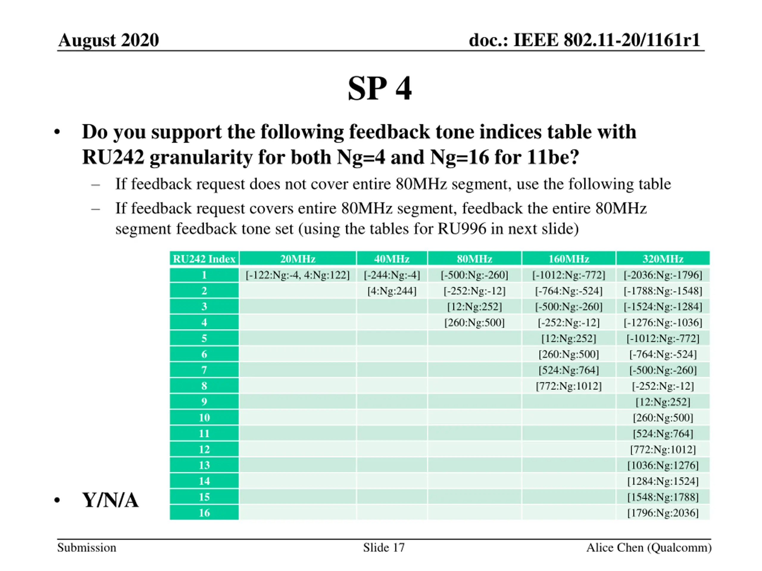 doc.: IEEE 802.11-20/1161r1 August 2020 SP 4 Do you support the following feedback tone indices table with RU242 granularity for both Ng=4 and Ng=16 for 11be? If feedback request does not cover entire 80MHz segment, use the following table If feedback request covers entire 80MHz segment, feedback the entire 80MHz segment feedback tone set (using the tables for RU996 in next slide) RU242 Index 1 2 3 4 5 6 7 8 9 10 11 12 13 14 15 16 20MHz 40MHz [-244:Ng:-4] [4:Ng:244] 80MHz [-500:Ng:-260] [-252:Ng:-12] [12:Ng:252] [260:Ng:500] 160MHz [-1012:Ng:-772] [-764:Ng:-524] [-500:Ng:-260] [-252:Ng:-12] [12:Ng:252] [260:Ng:500] [524:Ng:764] [772:Ng:1012] 320MHz [-2036:Ng:-1796] [-1788:Ng:-1548] [-1524:Ng:-1284] [-1276:Ng:-1036] [-1012:Ng:-772] [-764:Ng:-524] [-500:Ng:-260] [-252:Ng:-12] [12:Ng:252] [260:Ng:500] [524:Ng:764] [772:Ng:1012] [1036:Ng:1276] [1284:Ng:1524] [1548:Ng:1788] [1796:Ng:2036] [-122:Ng:-4, 4:Ng:122] Y/N/A Submission Slide 17 Alice Chen (Qualcomm)