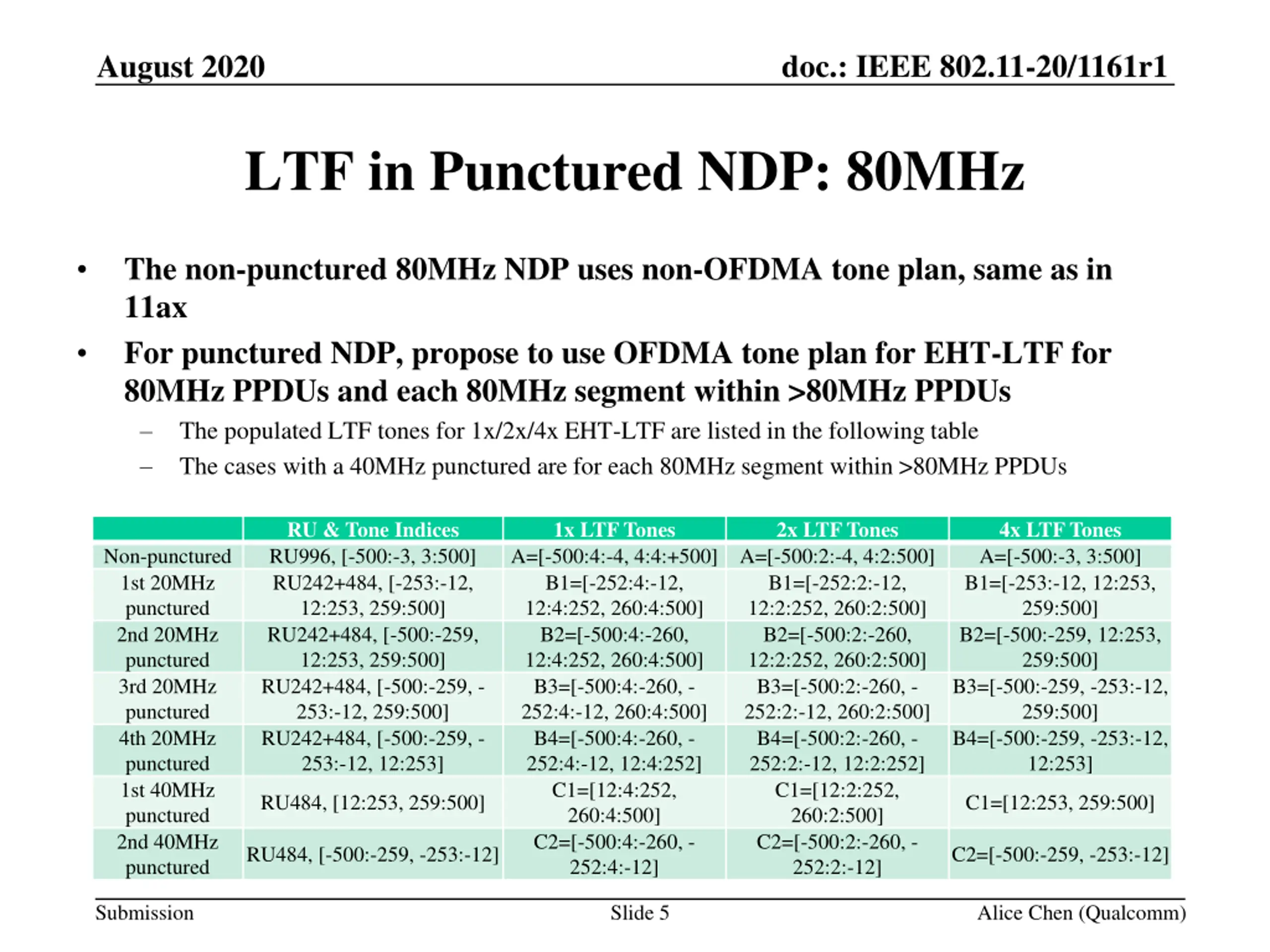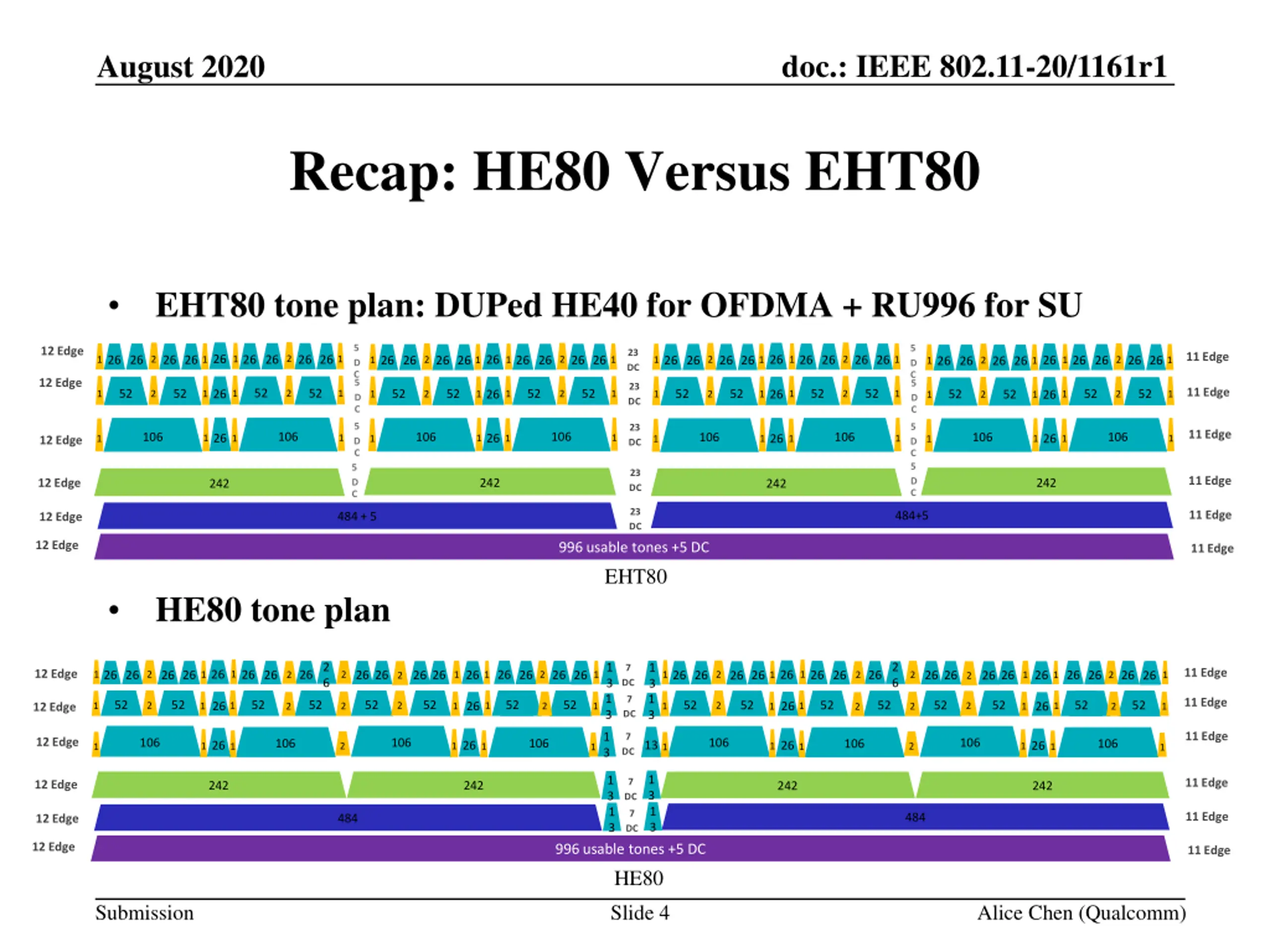 doc.: IEEE 802.11-20/1161r1 August 2020 Recap: HE80 Versus EHT80 EHT80 tone plan: DUPed HE40 for OFDMA + RU996 for SU 5 D C 5 D C 5 D C 5 D C 12 Edge 23 DC 11 Edge 26 26 26 26 26 26 26 26 26 26 26 26 26 26 26 2 26 26 26 26 26 26 26 26 26 1 1 2 2 26 26 26 26 26 26 26 26 2 1 1 1 1 2 26 26 26 26 1 1 2 2 1 1 1 1 1 1 2 1 1 12 Edge 23 DC 11 Edge 52 52 52 52 52 52 52 52 52 52 52 52 52 52 26 52 52 26 26 1 2 1 26 1 2 1 1 2 1 1 2 1 1 2 1 1 2 1 1 2 1 1 2 1 5 D C 5 D C 23 DC 11 Edge 106 106 106 106 106 106 106 106 26 26 26 26 1 1 1 1 1 1 1 1 1 1 1 1 1 1 1 1 12 Edge 5 D C 5 D C 23 DC 11 Edge 12 Edge 242 242 242 242 23 DC 11 Edge 484+5 484 + 5 12 Edge 12 Edge 996 usable tones +5 DC 11 Edge EHT80 HE80 tone plan 2 6 2 6 1 3 1 3 1 3 1 3 7 DC 11 Edge 12 Edge 26 26 26 26 26 26 26 26 26 26 26 26 26 26 26 26 26 26 26 26 26 26 26 26 26 26 26 26 26 26 26 26 26 26 26 26 1 26 26 1 1 2 2 1 2 1 2 1 1 1 2 2 1 2 1 1 1 2 2 2 7 DC 11 Edge 52 52 52 52 52 52 52 52 52 52 52 52 52 52 52 52 52 52 52 52 26 26 1 26 1 26 2 12 Edge 1 2 1 2 1 1 1 2 1 1 1 2 2 1 2 1 2 2 2 11 Edge 1 3 7 DC 12 Edge 106 106 106 106 106 106 106 106 13 26 26 26 26 1 1 2 1 1 2 1 1 1 1 1 1 1 1 1 3 1 3 1 3 1 3 11 Edge 7 DC 12 Edge 242 242 242 242 7 DC 11 Edge 484 484 12 Edge 12 Edge 996 usable tones +5 DC 11 Edge HE80 Submission Slide 4 Alice Chen (Qualcomm)