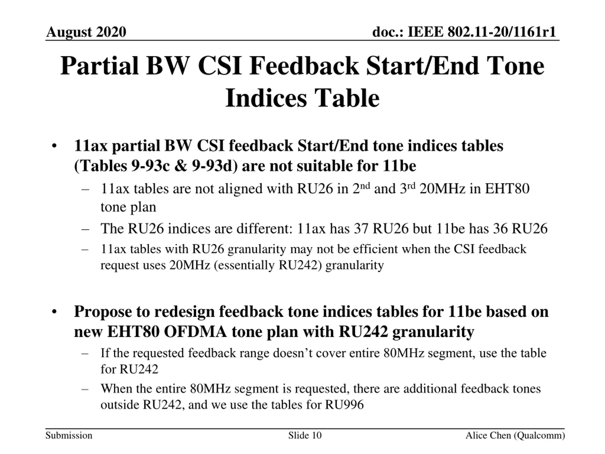 doc.: IEEE 802.11-20/1161r1 August 2020 Partial BW CSI Feedback Start/End Tone Indices Table 11ax partial BW CSI feedback Start/End tone indices tables (Tables 9-93c & 9-93d) are not suitable for 11be 11ax tables are not aligned with RU26 in 2nd and 3rd 20MHz in EHT80 tone plan The RU26 indices are different: 11ax has 37 RU26 but 11be has 36 RU26 11ax tables with RU26 granularity may not be efficient when the CSI feedback request uses 20MHz (essentially RU242) granularity Propose to redesign feedback tone indices tables for 11be based on new EHT80 OFDMA tone plan with RU242 granularity If the requested feedback range doesn t cover entire 80MHz segment, use the table for RU242 When the entire 80MHz segment is requested, there are additional feedback tones outside RU242, and we use the tables for RU996 Submission Slide 10 Alice Chen (Qualcomm)
