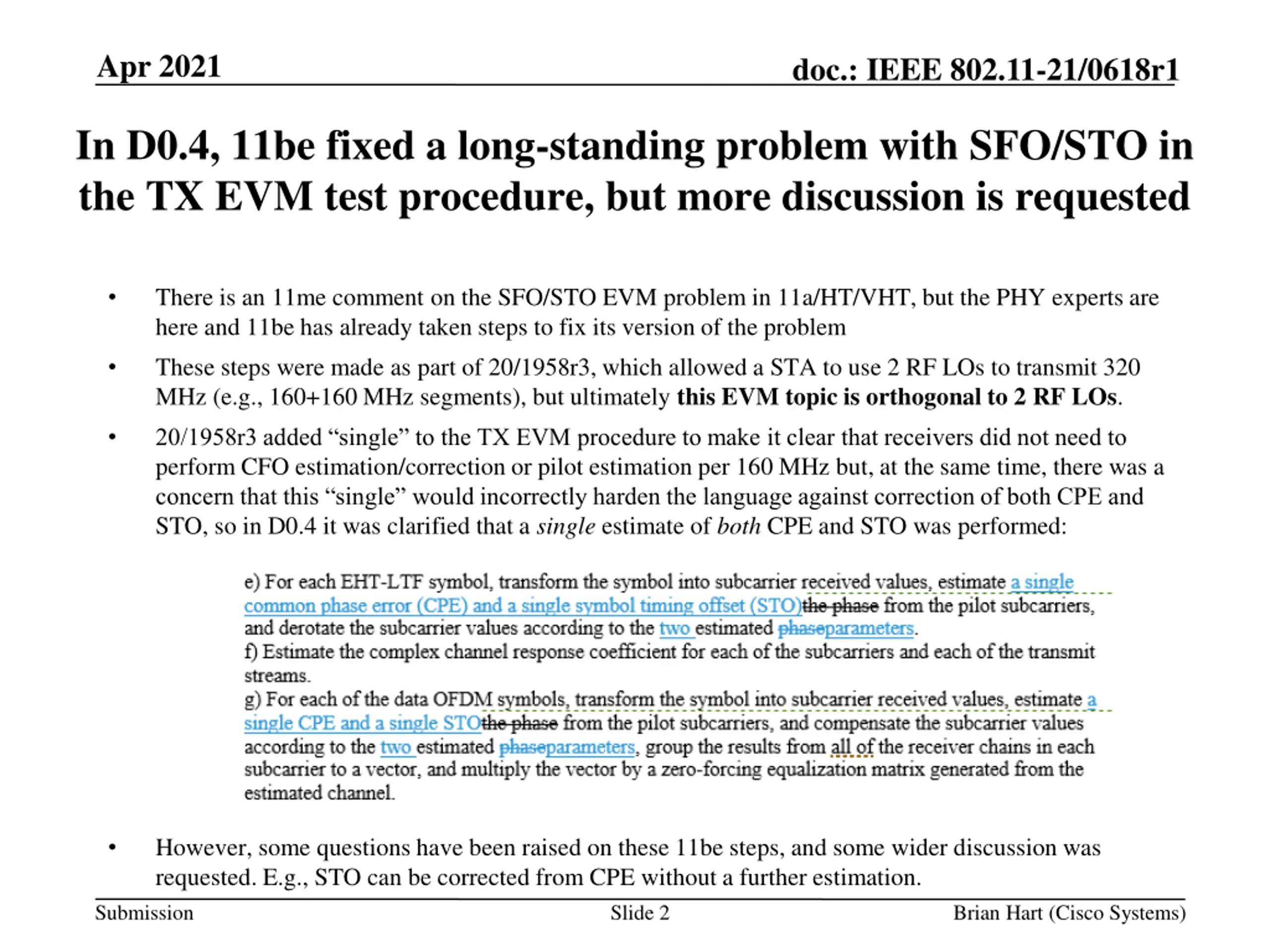 Apr 2021 doc.: IEEE 802.11-21/0618r1 In D0.4, 11be fixed a long-standing problem with SFO/STO in the TX EVM test procedure, but more discussion is requested There is an 11me comment on the SFO/STO EVM problem in 11a/HT/VHT, but the PHY experts are here and 11be has already taken steps to fix its version of the problem These steps were made as part of 20/1958r3, which allowed a STA to use 2 RF LOs to transmit 320 MHz (e.g., 160+160 MHz segments), but ultimately this EVM topic is orthogonal to 2 RF LOs. 20/1958r3 added single to the TX EVM procedure to make it clear that receivers did not need to perform CFO estimation/correction or pilot estimation per 160 MHz but, at the same time, there was a concern that this single would incorrectly harden the language against correction of both CPE and STO, so in D0.4 it was clarified that a single estimate of both CPE and STO was performed: However, some questions have been raised on these 11be steps, and some wider discussion was requested. E.g., STO can be corrected from CPE without a further estimation. Slide 2 Submission Brian Hart (Cisco Systems)