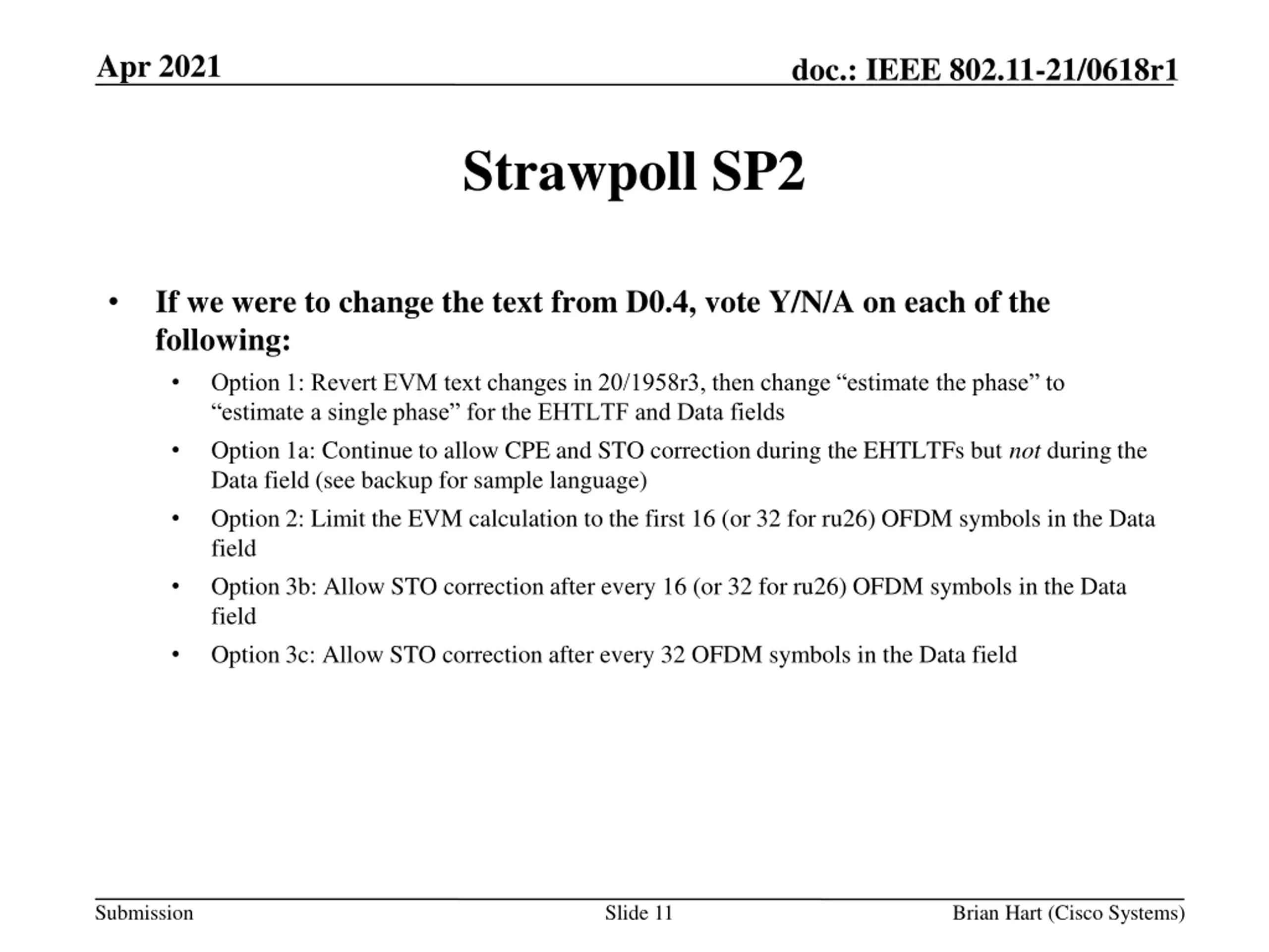 Apr 2021 doc.: IEEE 802.11-21/0618r1 Strawpoll SP2 If we were to change the text from D0.4, vote Y/N/A on each of the following: Option 1: Revert EVM text changes in 20/1958r3, then change estimate the phase to estimate a single phase for the EHTLTF and Data fields Option 1a: Continue to allow CPE and STO correction during the EHTLTFs but not during the Data field (see backup for sample language) Option 2: Limit the EVM calculation to the first 16 (or 32 for ru26) OFDM symbols in the Data field Option 3b: Allow STO correction after every 16 (or 32 for ru26) OFDM symbols in the Data field Option 3c: Allow STO correction after every 32 OFDM symbols in the Data field Submission Slide 11 Brian Hart (Cisco Systems)