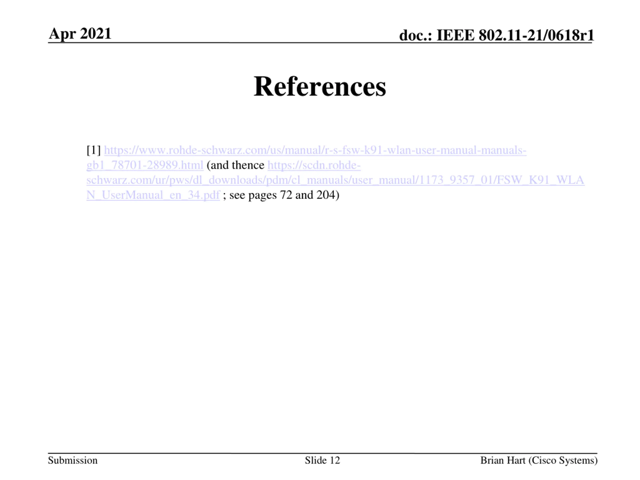 Apr 2021 doc.: IEEE 802.11-21/0618r1 References [1] https://www.rohde-schwarz.com/us/manual/r-s-fsw-k91-wlan-user-manual-manuals- gb1_78701-28989.html (and thence https://scdn.rohde- schwarz.com/ur/pws/dl_downloads/pdm/cl_manuals/user_manual/1173_9357_01/FSW_K91_WLA N_UserManual_en_34.pdf ; see pages 72 and 204) Submission Slide 12 Brian Hart (Cisco Systems)