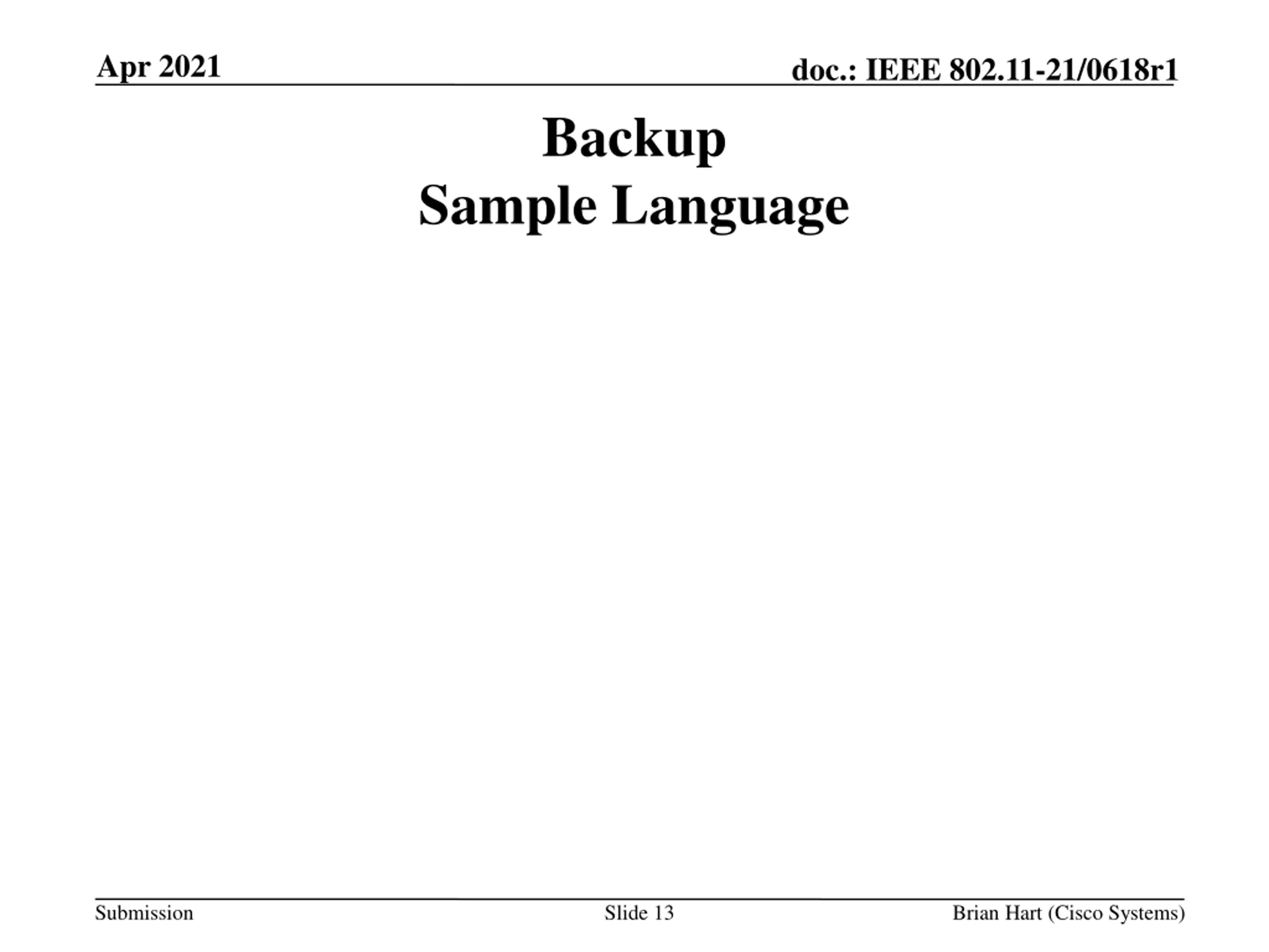 Apr 2021 doc.: IEEE 802.11-21/0618r1 Backup Sample Language Submission Slide 13 Brian Hart (Cisco Systems)
