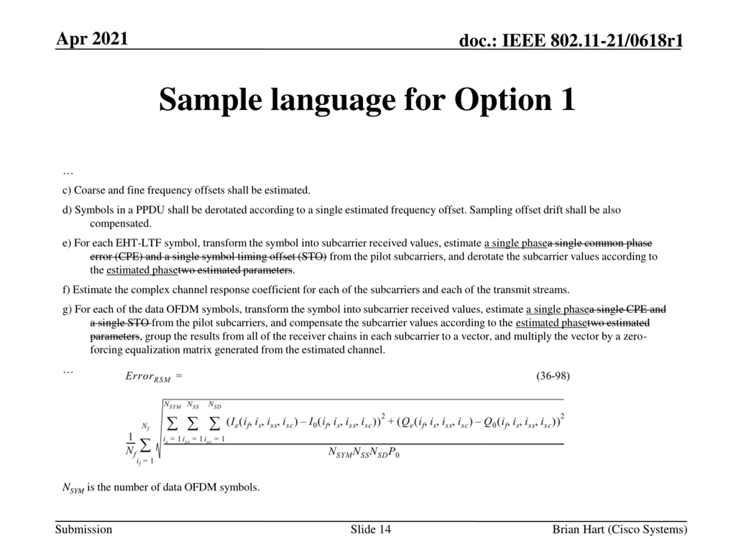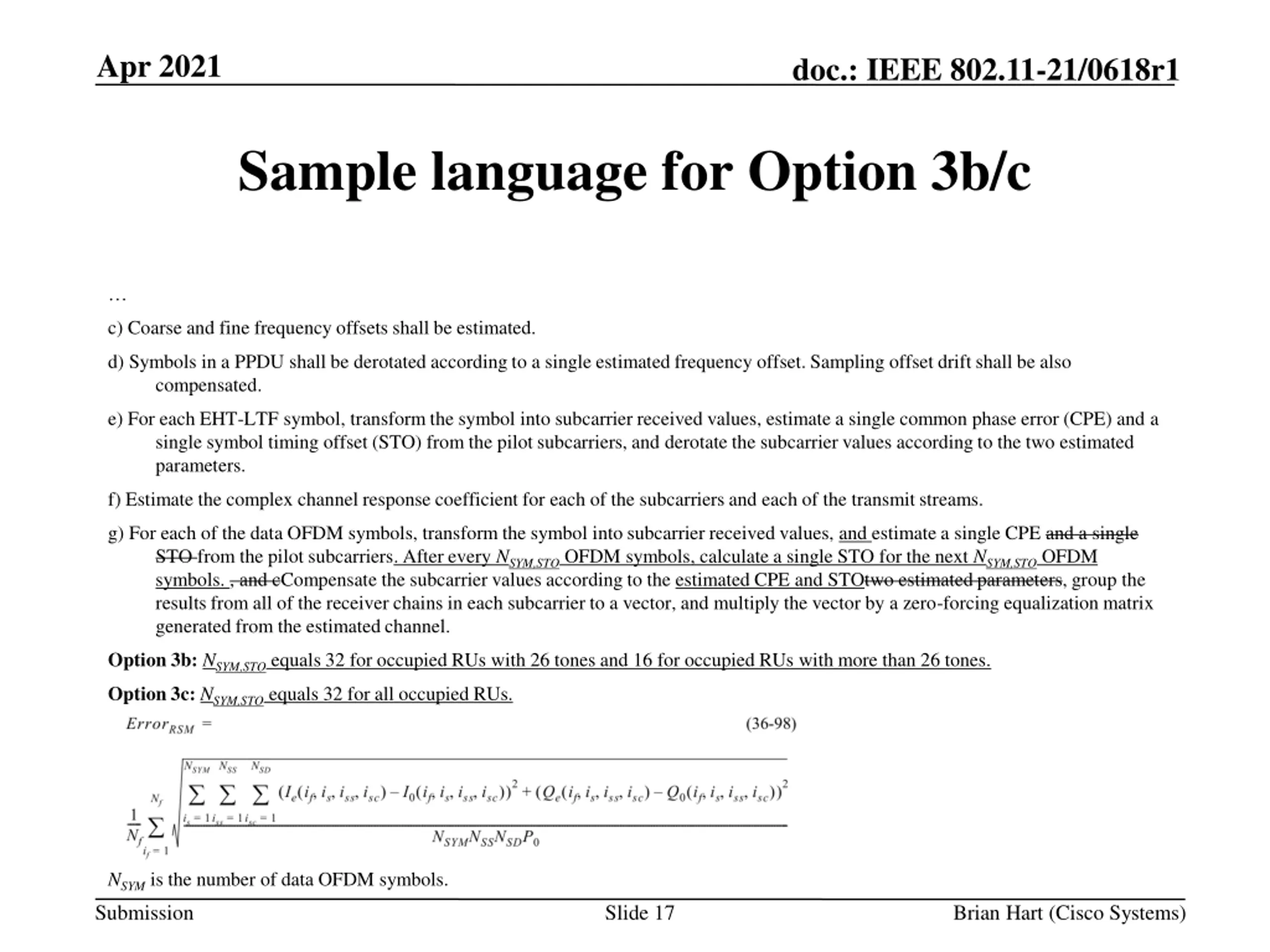 Apr 2021 doc.: IEEE 802.11-21/0618r1 Sample language for Option 3b/c c) Coarse and fine frequency offsets shall be estimated. d) Symbols in a PPDU shall be derotated according to a single estimated frequency offset. Sampling offset drift shall be also compensated. e) For each EHT-LTF symbol, transform the symbol into subcarrier received values, estimate a single common phase error (CPE) and a single symbol timing offset (STO) from the pilot subcarriers, and derotate the subcarrier values according to the two estimated parameters. f) Estimate the complex channel response coefficient for each of the subcarriers and each of the transmit streams. g) For each of the data OFDM symbols, transform the symbol into subcarrier received values, and estimate a single CPE and a single STO from the pilot subcarriers. After every NSYM,STOOFDM symbols, calculate a single STO for the next NSYM,STOOFDM symbols. , and cCompensate the subcarrier values according to the estimated CPE and STOtwo estimated parameters, group the results from all of the receiver chains in each subcarrier to a vector, and multiply the vector by a zero-forcing equalization matrix generated from the estimated channel. Option 3b: NSYM,STO equals 32 for occupied RUs with 26 tones and 16 for occupied RUs with more than 26 tones. Option 3c: NSYM,STOequals 32 for all occupied RUs. NSYM is the number of data OFDM symbols. Submission Slide 17 Brian Hart (Cisco Systems)