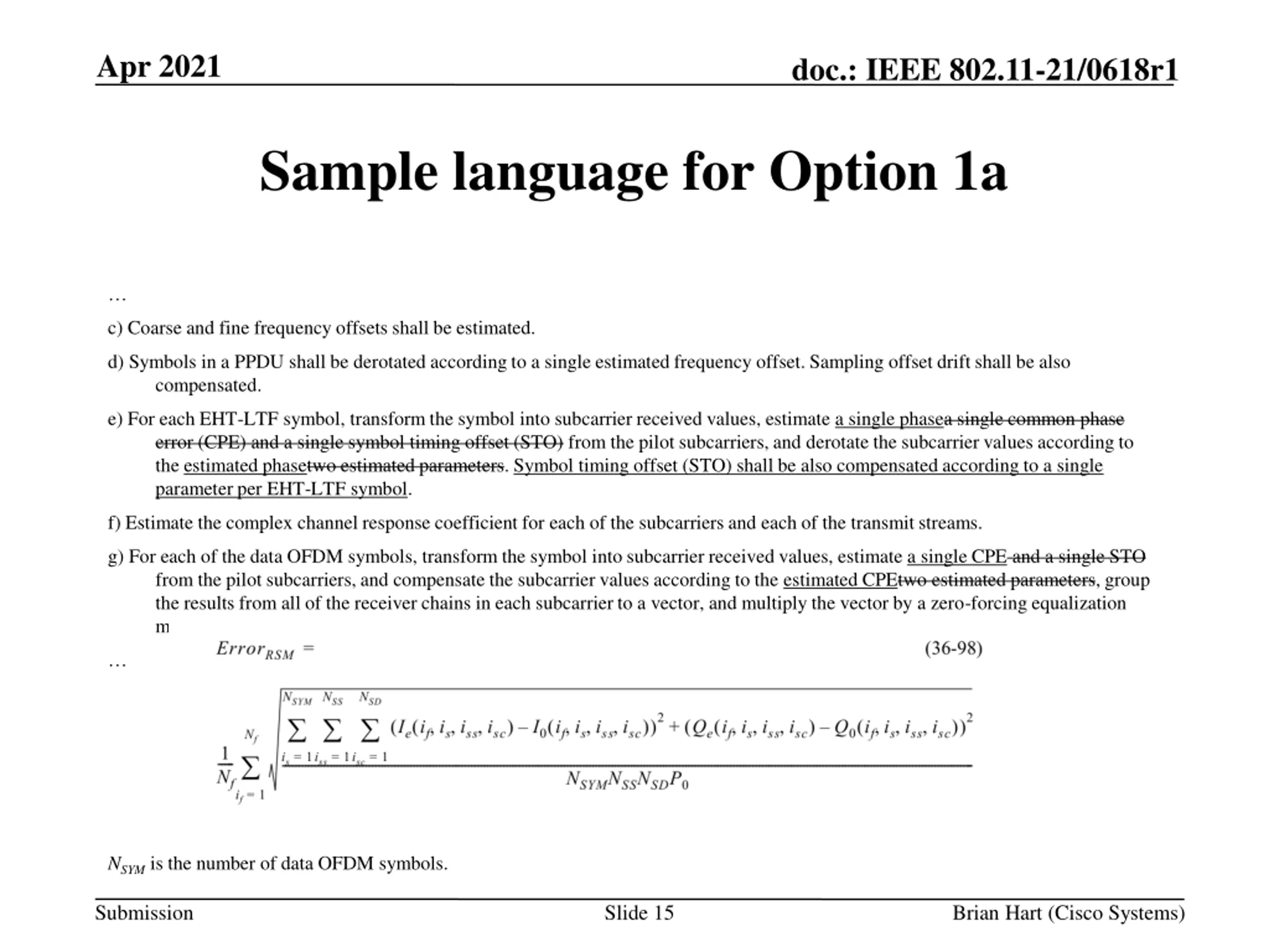Apr 2021 doc.: IEEE 802.11-21/0618r1 Sample language for Option 1 c) Coarse and fine frequency offsets shall be estimated. d) Symbols in a PPDU shall be derotated according to a single estimated frequency offset. Sampling offset drift shall be also compensated. e) For each EHT-LTF symbol, transform the symbol into subcarrier received values, estimate a single phasea single common phase error (CPE) and a single symbol timing offset (STO) from the pilot subcarriers, and derotate the subcarrier values according to the estimated phasetwo estimated parameters. f) Estimate the complex channel response coefficient for each of the subcarriers and each of the transmit streams. g) For each of the data OFDM symbols, transform the symbol into subcarrier received values, estimate a single phasea single CPE and a single STO from the pilot subcarriers, and compensate the subcarrier values according to the estimated phasetwo estimated parameters, group the results from all of the receiver chains in each subcarrier to a vector, and multiply the vector by a zero- forcing equalization matrix generated from the estimated channel. NSYM is the number of data OFDM symbols. Submission Slide 14 Brian Hart (Cisco Systems)