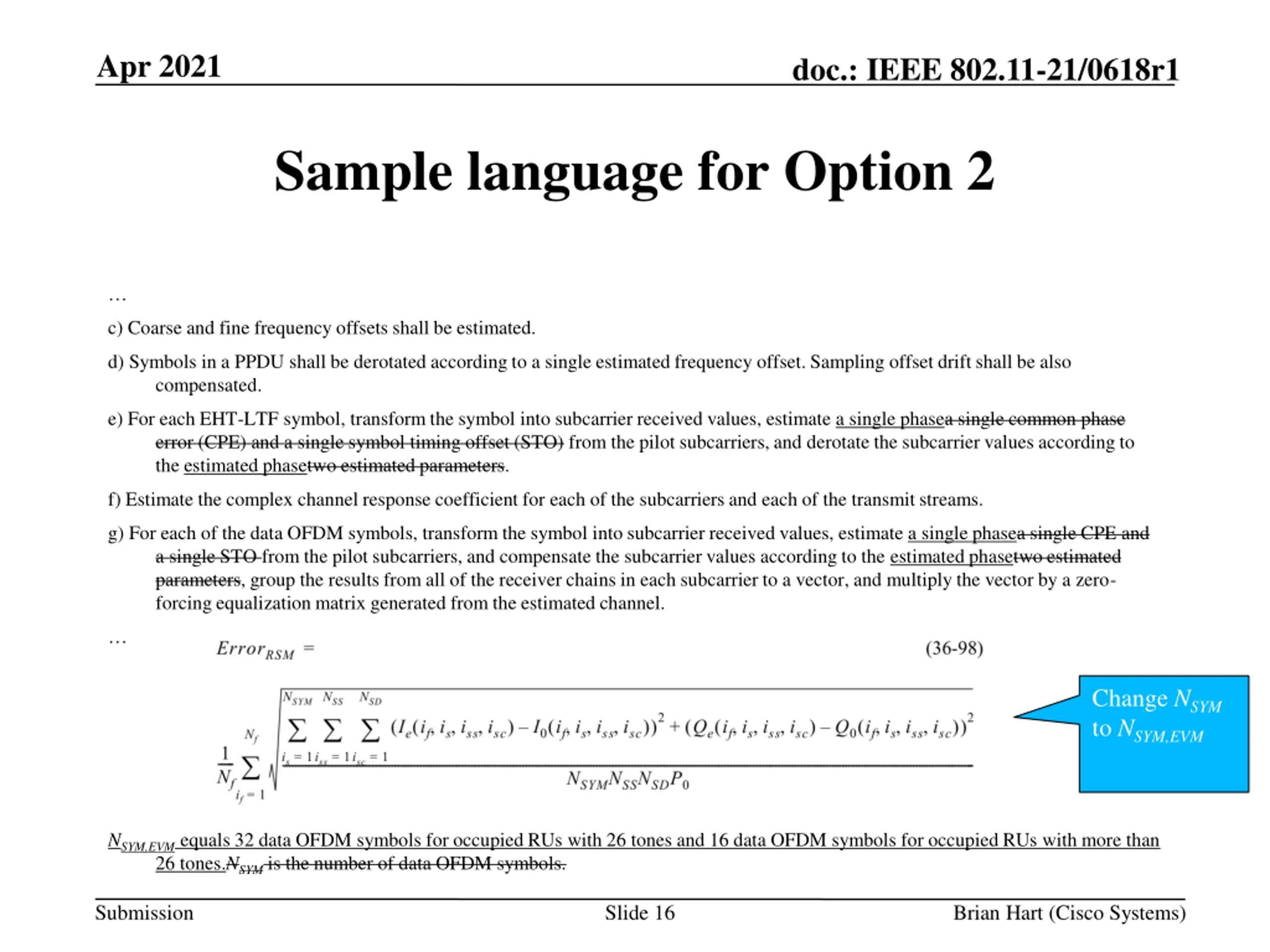 Apr 2021 doc.: IEEE 802.11-21/0618r1 Sample language for Option 1a c) Coarse and fine frequency offsets shall be estimated. d) Symbols in a PPDU shall be derotated according to a single estimated frequency offset. Sampling offset drift shall be also compensated. e) For each EHT-LTF symbol, transform the symbol into subcarrier received values, estimate a single phasea single common phase error (CPE) and a single symbol timing offset (STO) from the pilot subcarriers, and derotate the subcarrier values according to the estimated phasetwo estimated parameters. Symbol timing offset (STO) shall be also compensated according to a single parameter per EHT-LTF symbol. f) Estimate the complex channel response coefficient for each of the subcarriers and each of the transmit streams. g) For each of the data OFDM symbols, transform the symbol into subcarrier received values, estimate a single CPE and a single STO from the pilot subcarriers, and compensate the subcarrier values according to the estimated CPEtwo estimated parameters, group the results from all of the receiver chains in each subcarrier to a vector, and multiply the vector by a zero-forcing equalization matrix generated from the estimated channel. NSYM is the number of data OFDM symbols. Submission Slide 15 Brian Hart (Cisco Systems)