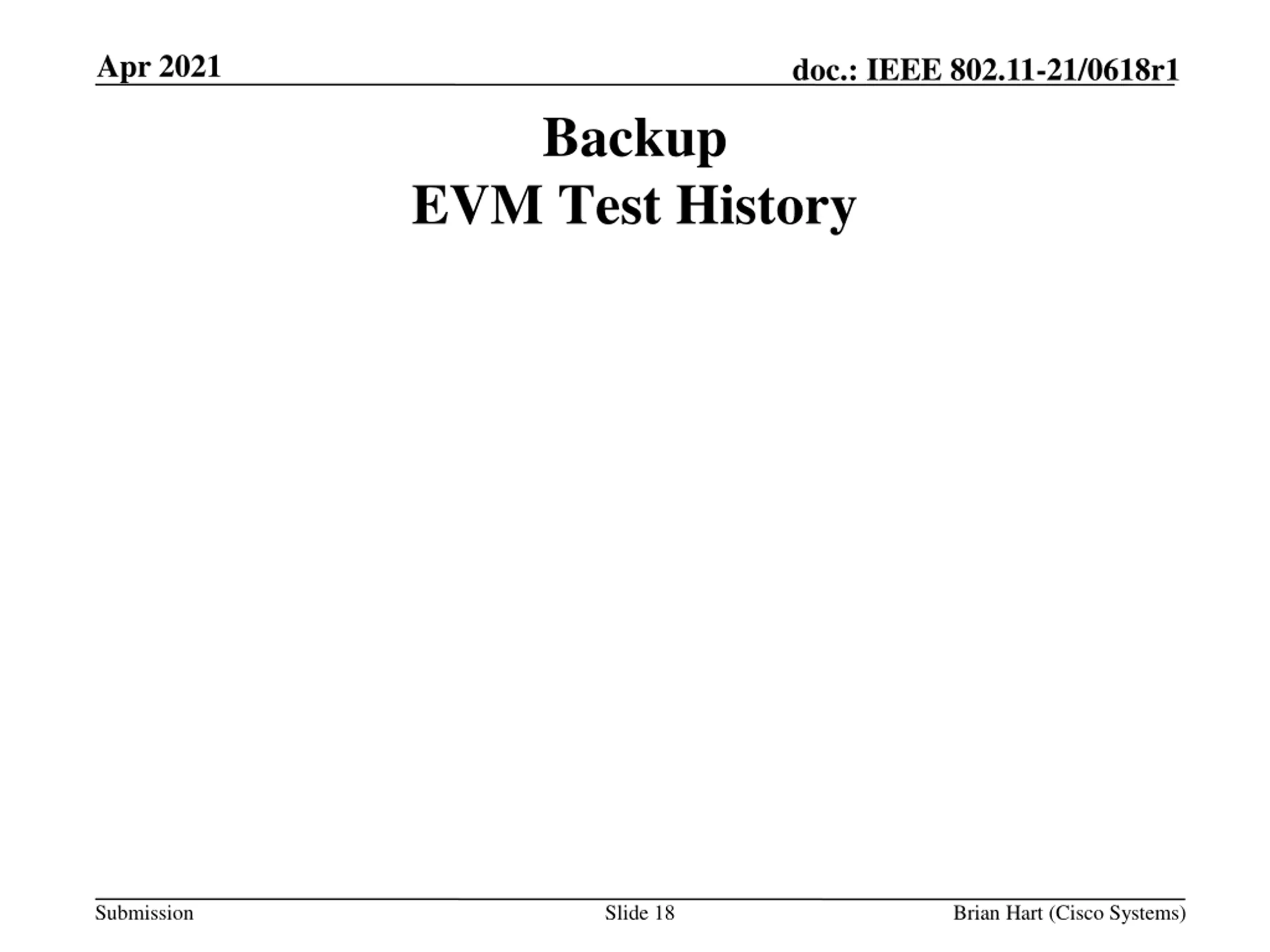 Apr 2021 doc.: IEEE 802.11-21/0618r1 Backup EVM Test History Submission Slide 18 Brian Hart (Cisco Systems)