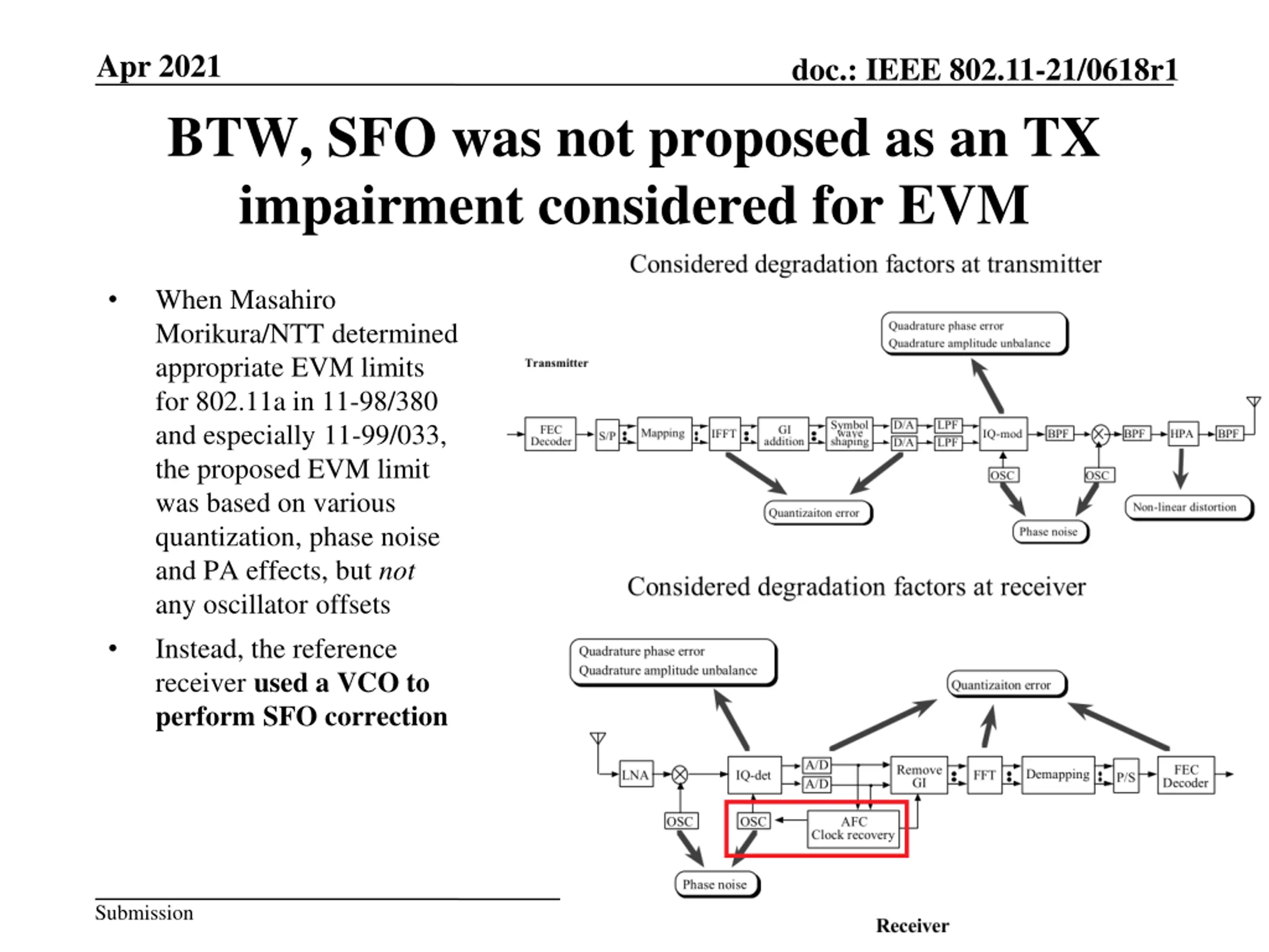 Apr 2021 doc.: IEEE 802.11-21/0618r1 BTW, SFO was not proposed as an TX impairment considered for EVM When Masahiro Morikura/NTT determined appropriate EVM limits for 802.11a in 11-98/380 and especially 11-99/033, the proposed EVM limit was based on various quantization, phase noise and PA effects, but not any oscillator offsets Instead, the reference receiver used a VCO to perform SFO correction Submission Slide 20 Brian Hart (Cisco Systems)