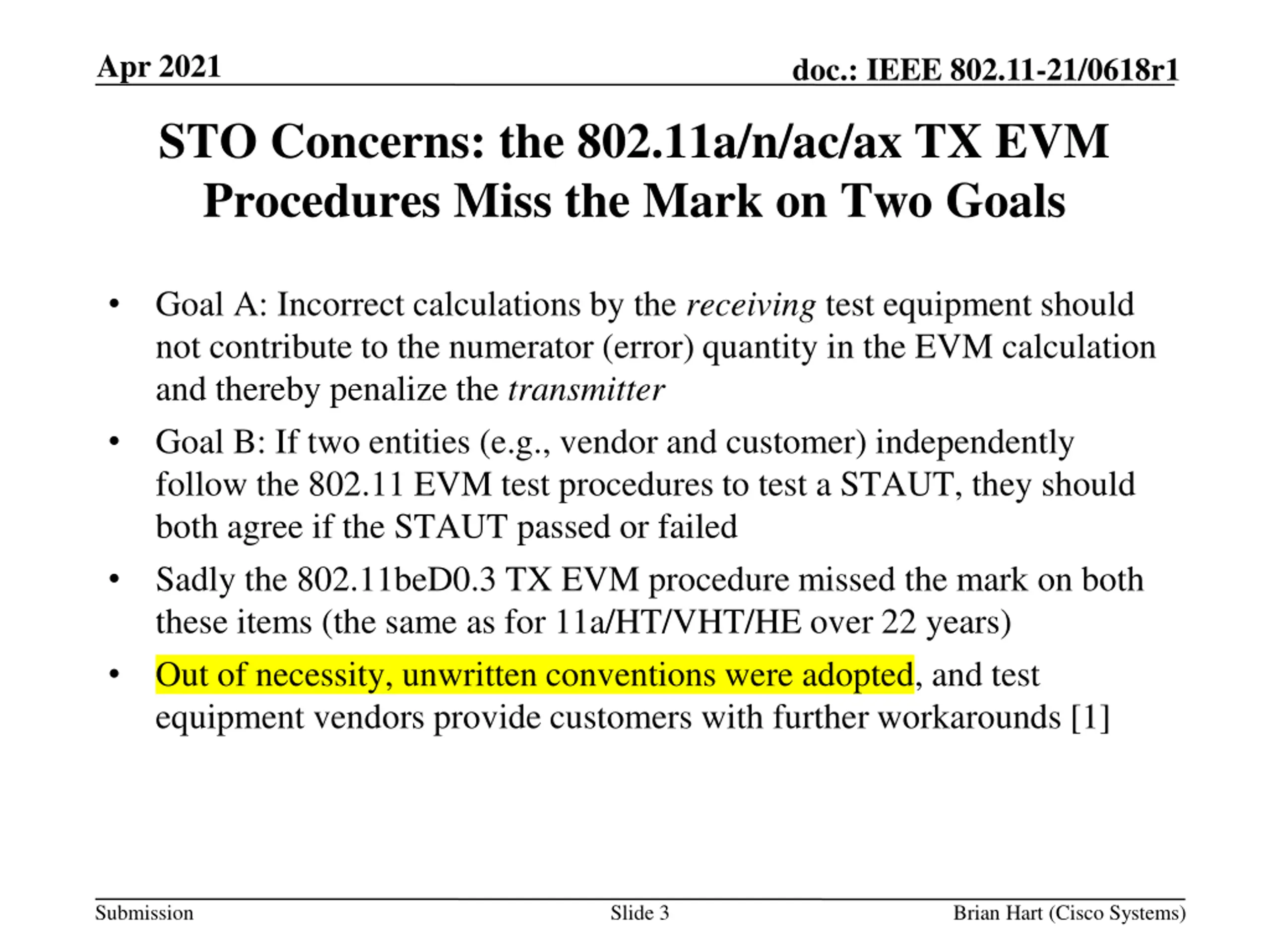 Apr 2021 doc.: IEEE 802.11-21/0618r1 STO Concerns: the 802.11a/n/ac/ax TX EVM Procedures Miss the Mark on Two Goals Goal A: Incorrect calculations by the receiving test equipment should not contribute to the numerator (error) quantity in the EVM calculation and thereby penalize the transmitter Goal B: If two entities (e.g., vendor and customer) independently follow the 802.11 EVM test procedures to test a STAUT, they should both agree if the STAUT passed or failed Sadly the 802.11beD0.3 TX EVM procedure missed the mark on both these items (the same as for 11a/HT/VHT/HE over 22 years) Out of necessity, unwritten conventions were adopted, and test equipment vendors provide customers with further workarounds [1] Submission Slide 3 Brian Hart (Cisco Systems)