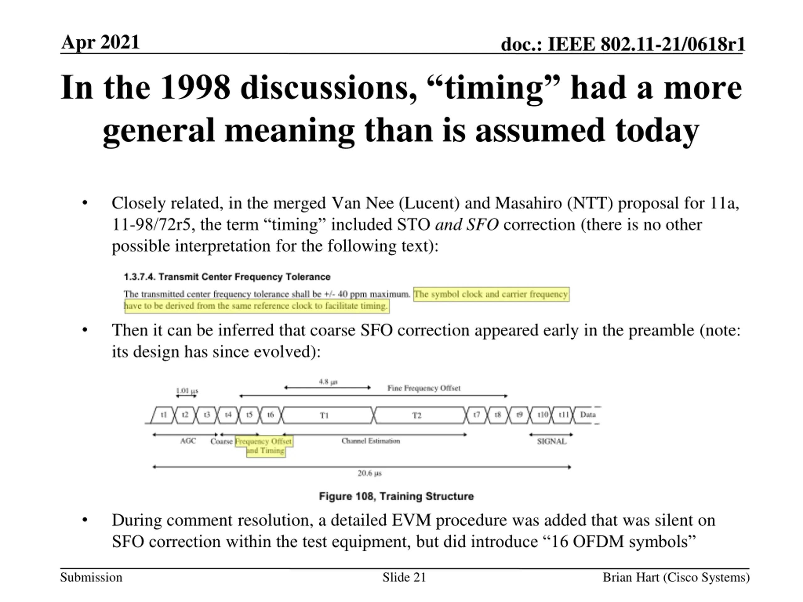 Apr 2021 doc.: IEEE 802.11-21/0618r1 In the 1998 discussions, timing had a more general meaning than is assumed today Closely related, in the merged Van Nee (Lucent) and Masahiro (NTT) proposal for 11a, 11-98/72r5, the term timing included STO and SFO correction (there is no other possible interpretation for the following text): Then it can be inferred that coarse SFO correction appeared early in the preamble (note: its design has since evolved): During comment resolution, a detailed EVM procedure was added that was silent on SFO correction within the test equipment, but did introduce 16 OFDM symbols Submission Slide 21 Brian Hart (Cisco Systems)