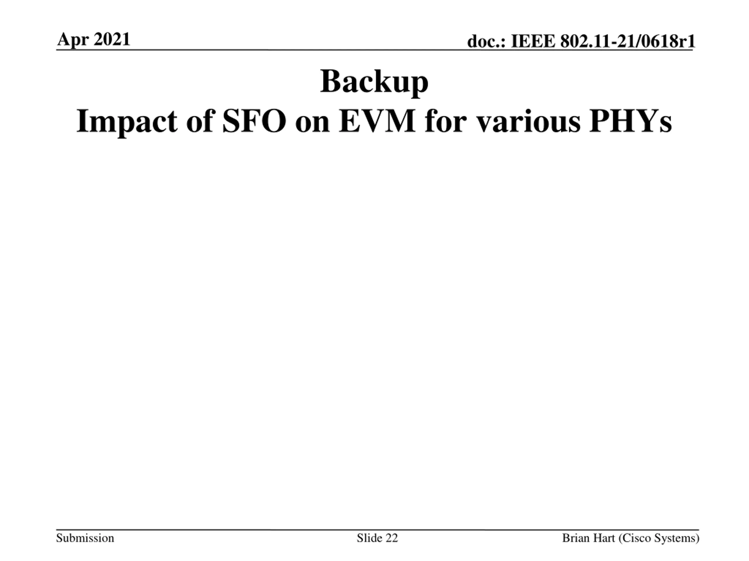 Apr 2021 doc.: IEEE 802.11-21/0618r1 Backup Impact of SFO on EVM for various PHYs Submission Slide 22 Brian Hart (Cisco Systems)