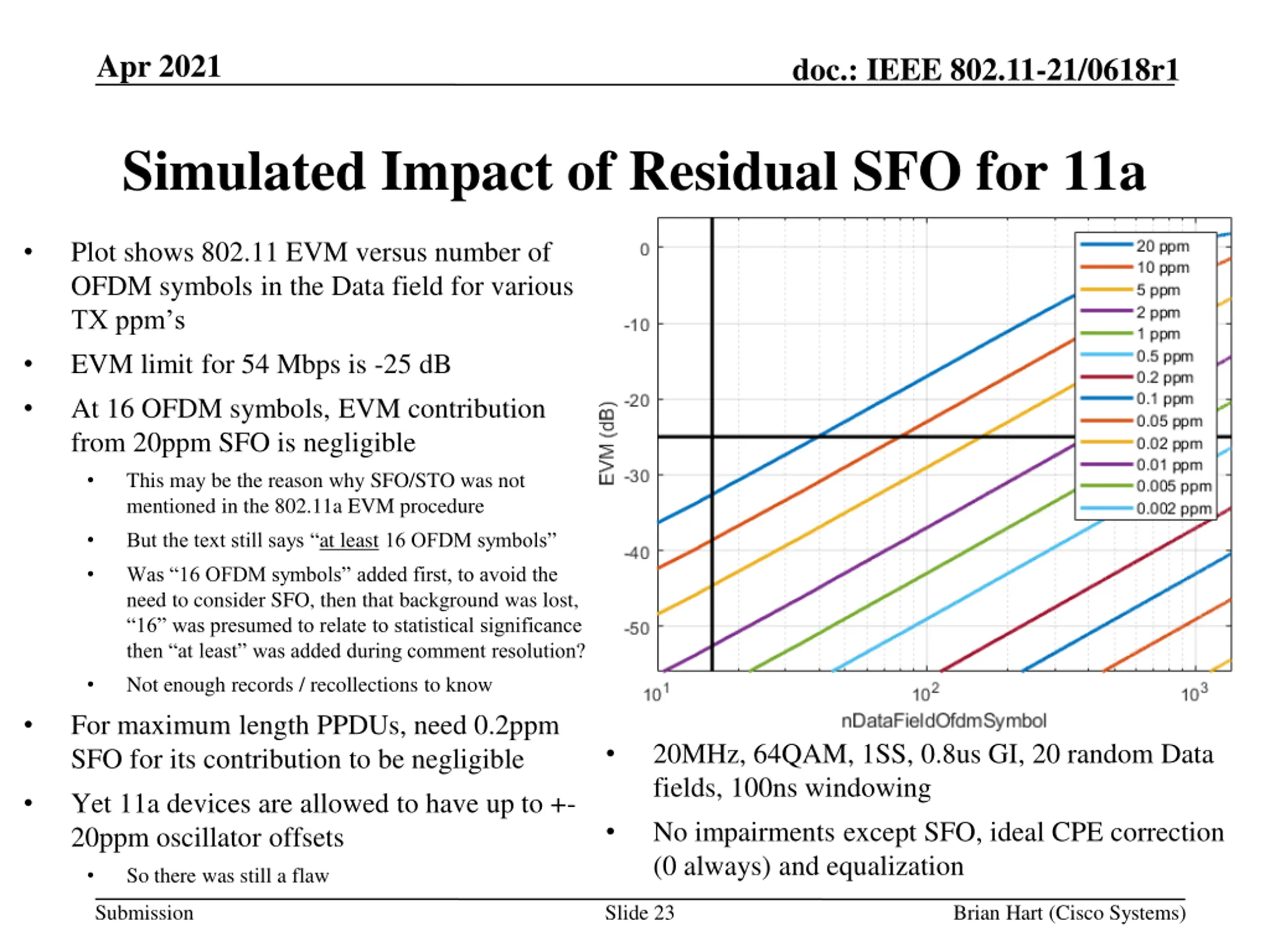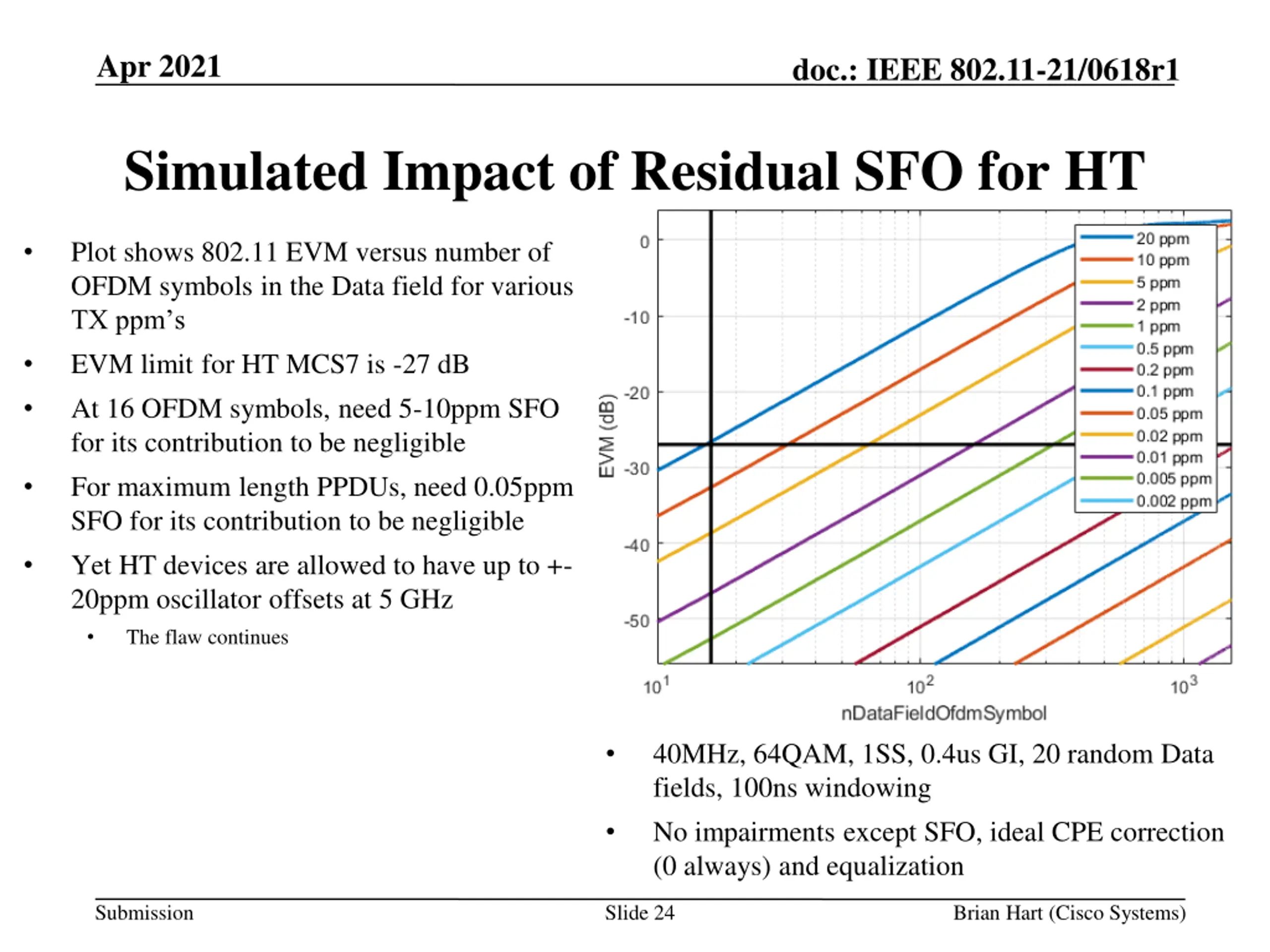 Apr 2021 doc.: IEEE 802.11-21/0618r1 Simulated Impact of Residual SFO for 11a Plot shows 802.11 EVM versus number of OFDM symbols in the Data field for various TX ppm s EVM limit for 54 Mbps is -25 dB At 16 OFDM symbols, EVM contribution from 20ppm SFO is negligible This may be the reason why SFO/STO was not mentioned in the 802.11a EVM procedure But the text still says at least 16 OFDM symbols Was 16 OFDM symbols added first, to avoid the need to consider SFO, then that background was lost, 16 was presumed to relate to statistical significance then at least was added during comment resolution? Not enough records / recollections to know For maximum length PPDUs, need 0.2ppm SFO for its contribution to be negligible Yet 11a devices are allowed to have up to +- 20ppm oscillator offsets So there was still a flaw 20MHz, 64QAM, 1SS, 0.8us GI, 20 random Data fields, 100ns windowing No impairments except SFO, ideal CPE correction (0 always) and equalization Submission Slide 23 Brian Hart (Cisco Systems)