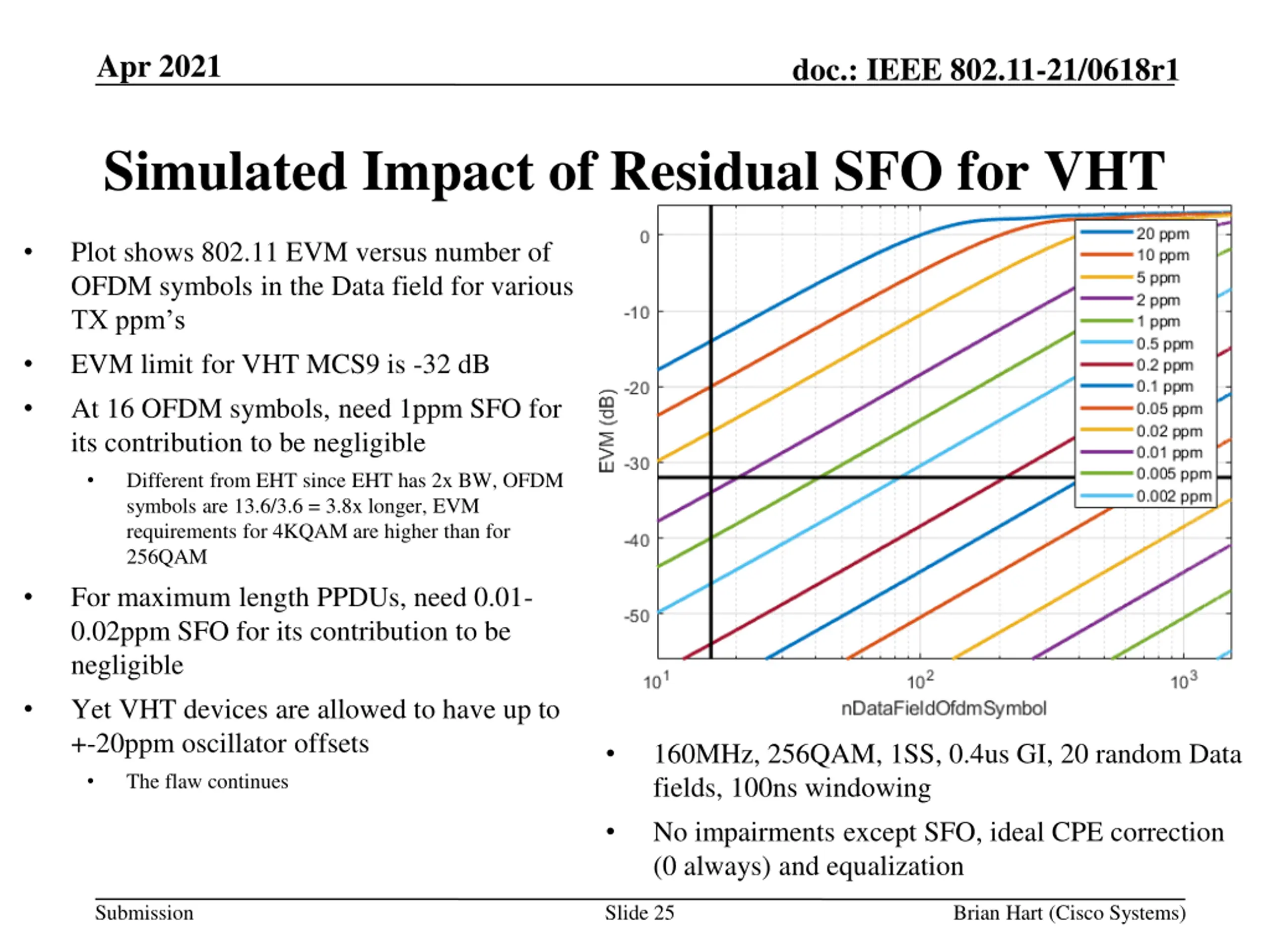 Apr 2021 doc.: IEEE 802.11-21/0618r1 Simulated Impact of Residual SFO for VHT Plot shows 802.11 EVM versus number of OFDM symbols in the Data field for various TX ppm s EVM limit for VHT MCS9 is -32 dB At 16 OFDM symbols, need 1ppm SFO for its contribution to be negligible Different from EHT since EHT has 2x BW, OFDM symbols are 13.6/3.6 = 3.8x longer, EVM requirements for 4KQAM are higher than for 256QAM For maximum length PPDUs, need 0.01- 0.02ppm SFO for its contribution to be negligible Yet VHT devices are allowed to have up to +-20ppm oscillator offsets The flaw continues 160MHz, 256QAM, 1SS, 0.4us GI, 20 random Data fields, 100ns windowing No impairments except SFO, ideal CPE correction (0 always) and equalization Submission Slide 25 Brian Hart (Cisco Systems)
