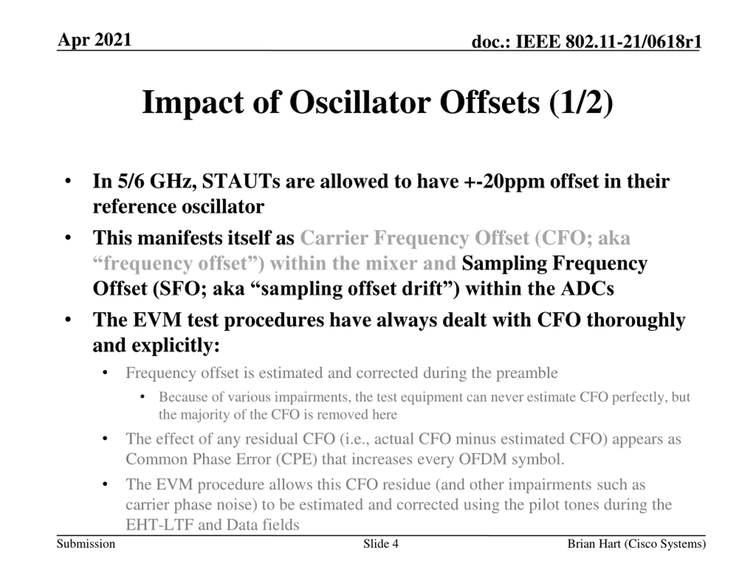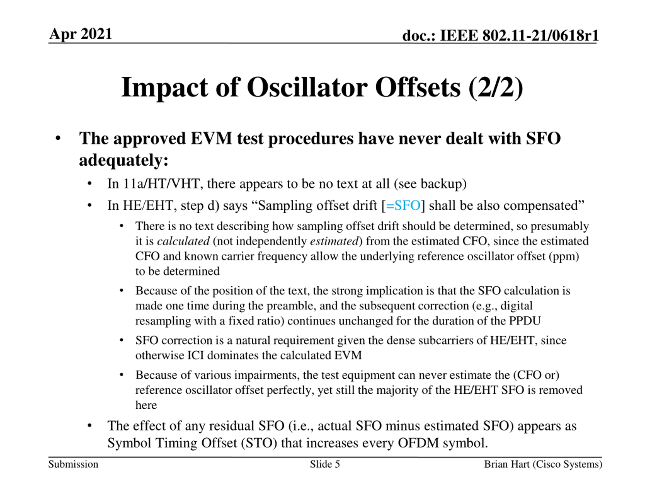 Apr 2021 doc.: IEEE 802.11-21/0618r1 Impact of Oscillator Offsets (1/2) In 5/6 GHz, STAUTs are allowed to have +-20ppm offset in their reference oscillator This manifests itself as Carrier Frequency Offset (CFO; aka frequency offset ) within the mixer and Sampling Frequency Offset (SFO; aka sampling offset drift ) within the ADCs The EVM test procedures have always dealt with CFO thoroughly and explicitly: Frequency offset is estimated and corrected during the preamble Because of various impairments, the test equipment can never estimate CFO perfectly, but the majority of the CFO is removed here The effect of any residual CFO (i.e., actual CFO minus estimated CFO) appears as Common Phase Error (CPE) that increases every OFDM symbol. The EVM procedure allows this CFO residue (and other impairments such as carrier phase noise) to be estimated and corrected using the pilot tones during the EHT-LTF and Data fields Slide 4 Submission Brian Hart (Cisco Systems)