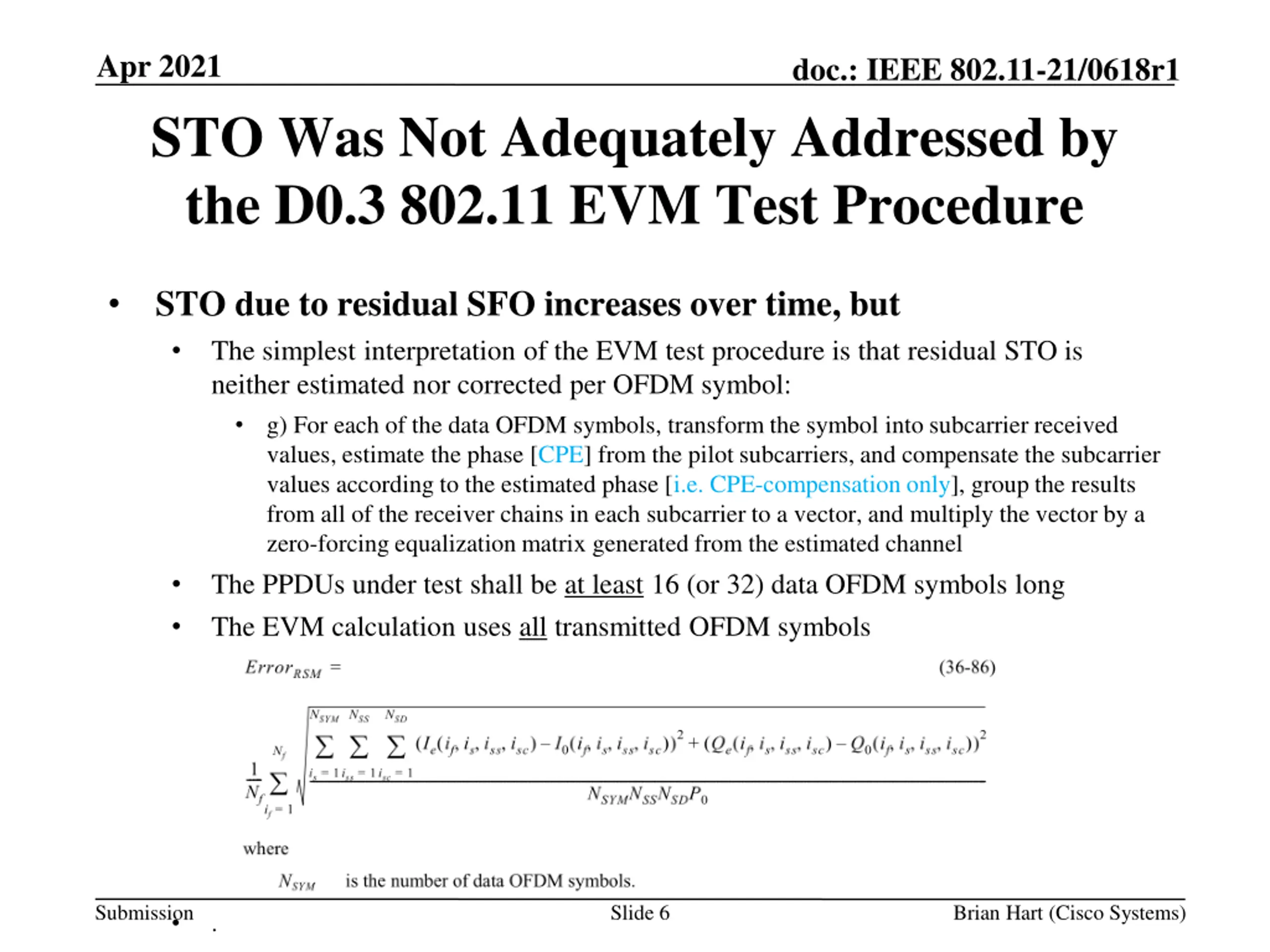 Apr 2021 doc.: IEEE 802.11-21/0618r1 STO Was Not Adequately Addressed by the D0.3 802.11 EVM Test Procedure STO due to residual SFO increases over time, but The simplest interpretation of the EVM test procedure is that residual STO is neither estimated nor corrected per OFDM symbol: g) For each of the data OFDM symbols, transform the symbol into subcarrier received values, estimate the phase [CPE] from the pilot subcarriers, and compensate the subcarrier values according to the estimated phase [i.e. CPE-compensation only], group the results from all of the receiver chains in each subcarrier to a vector, and multiply the vector by a zero-forcing equalization matrix generated from the estimated channel The PPDUs under test shall be at least 16 (or 32) data OFDM symbols long The EVM calculation uses all transmitted OFDM symbols Submission Slide 6 Brian Hart (Cisco Systems) .
